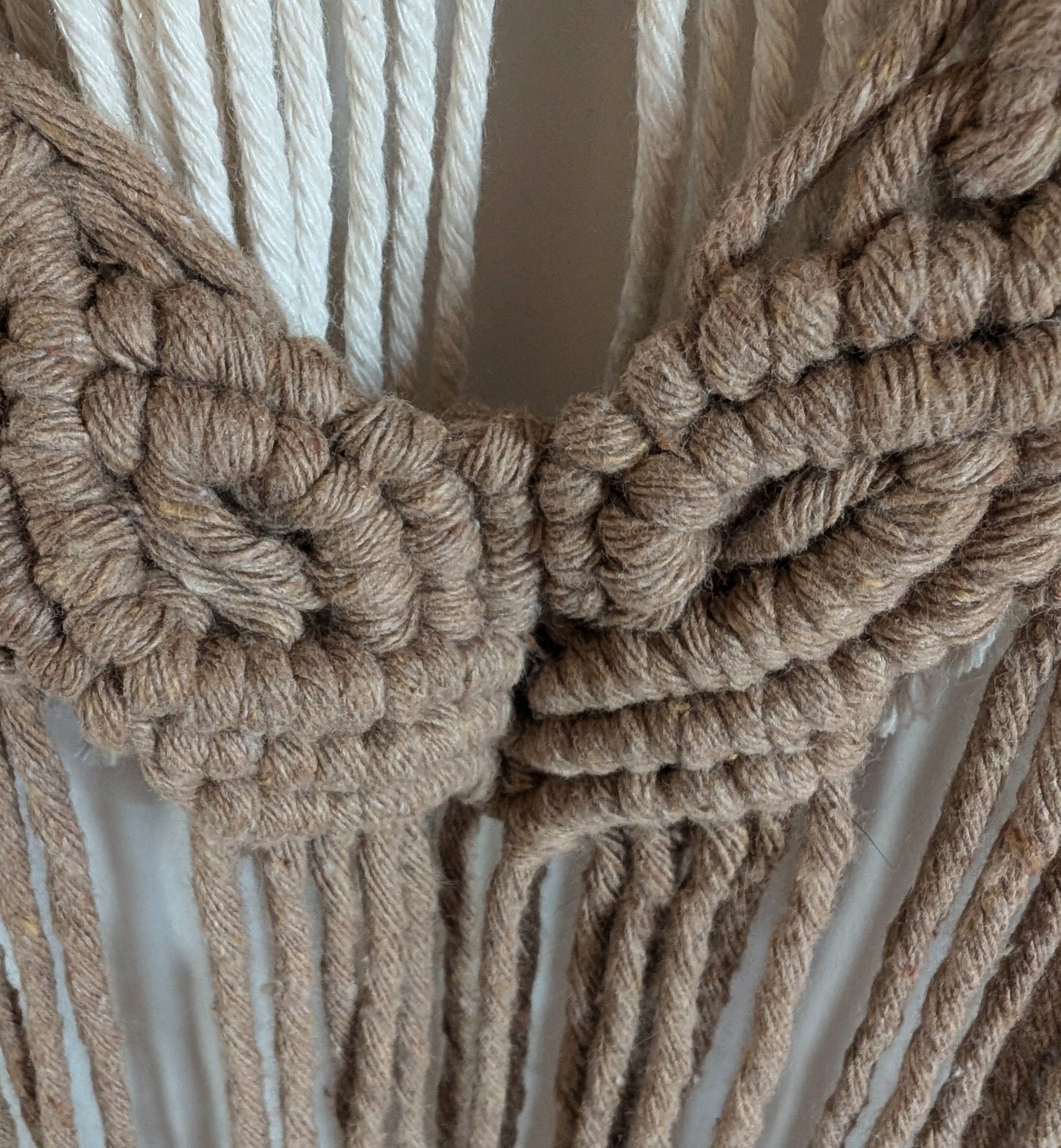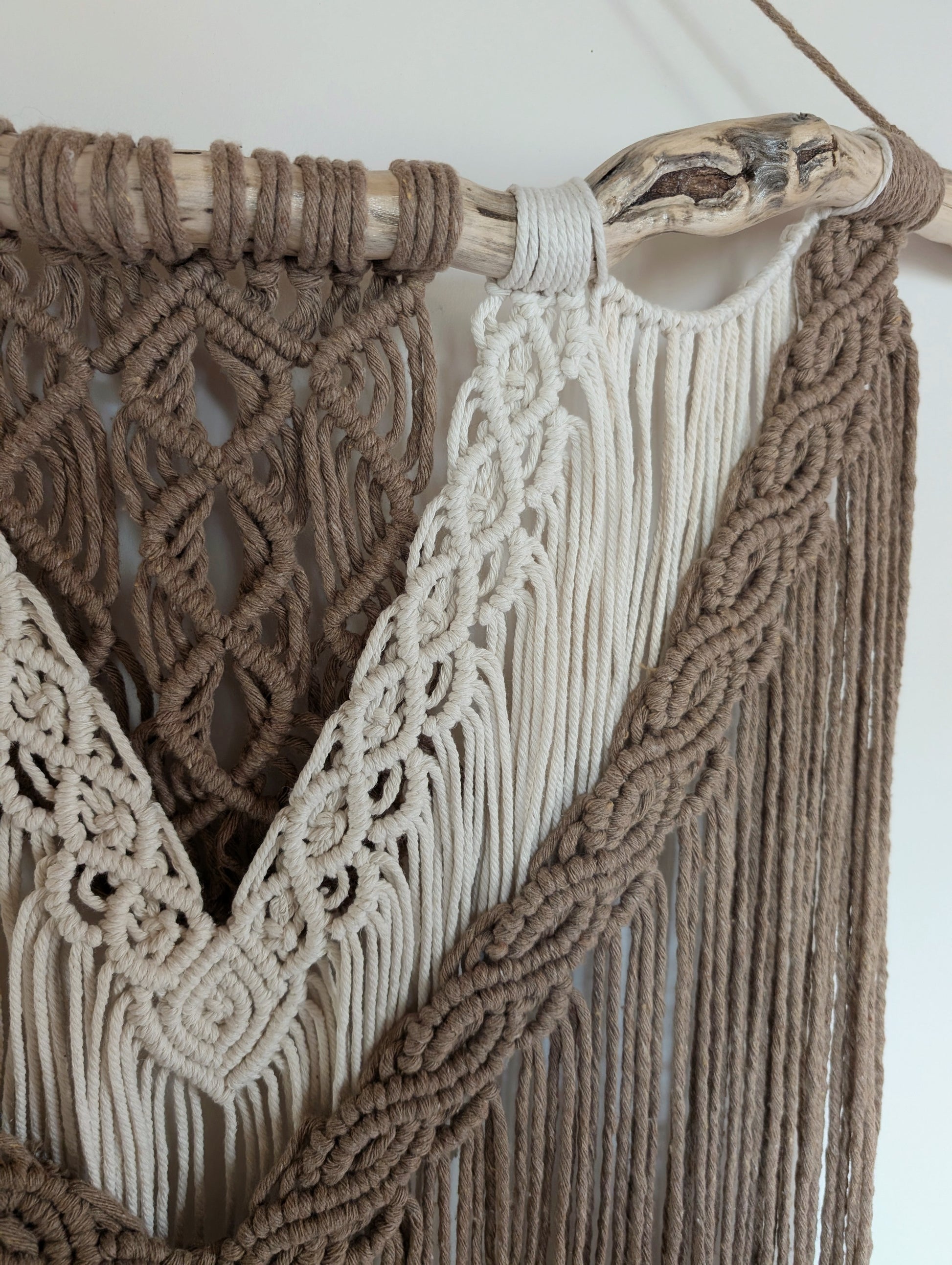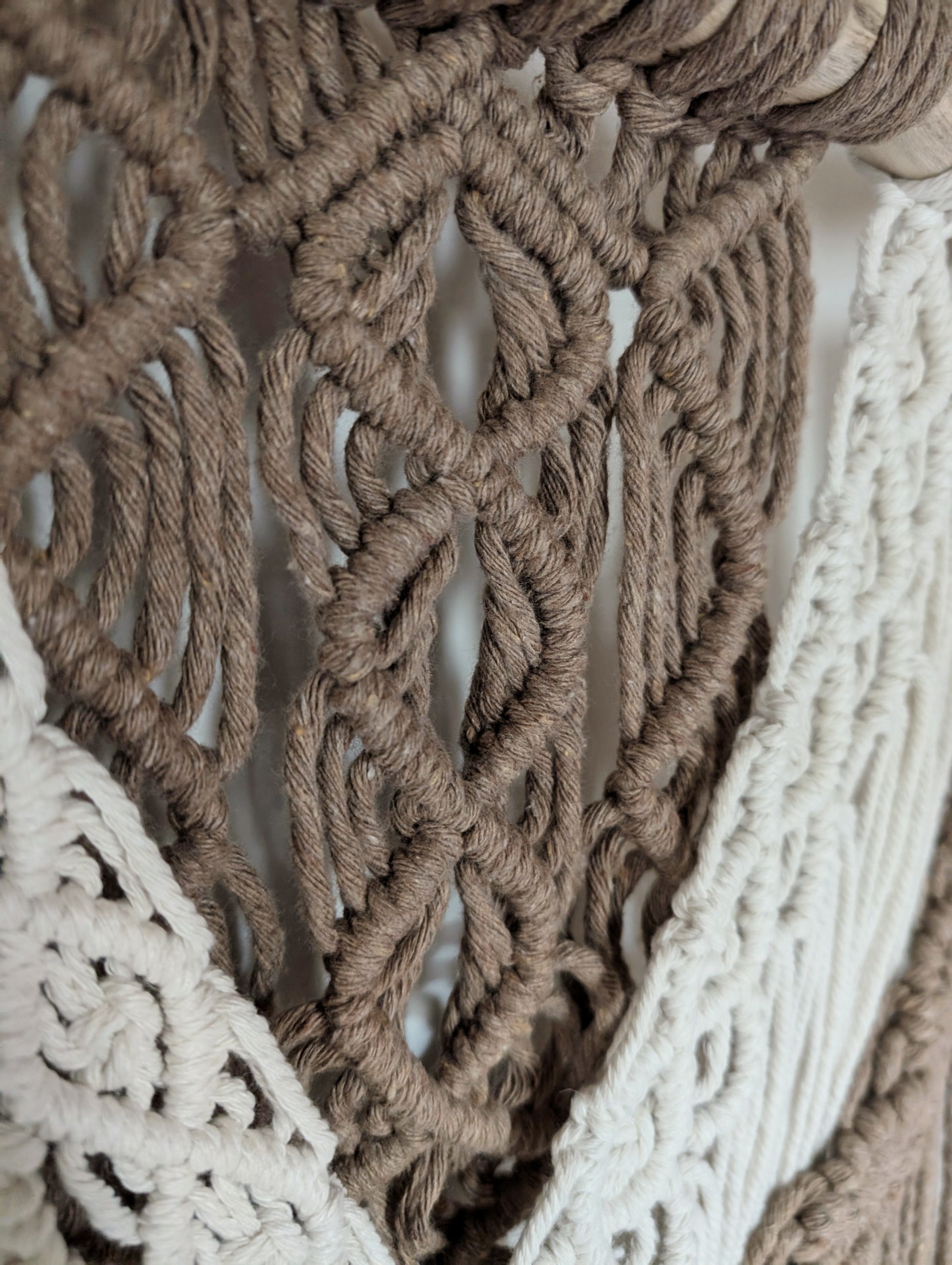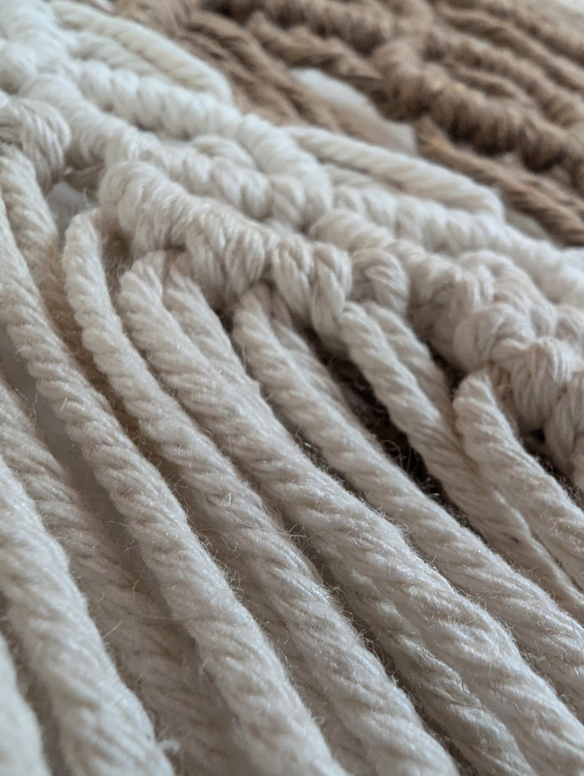 Dall'intreccio di fili in puro cotone nasce questo arazzo da parete in macramè.