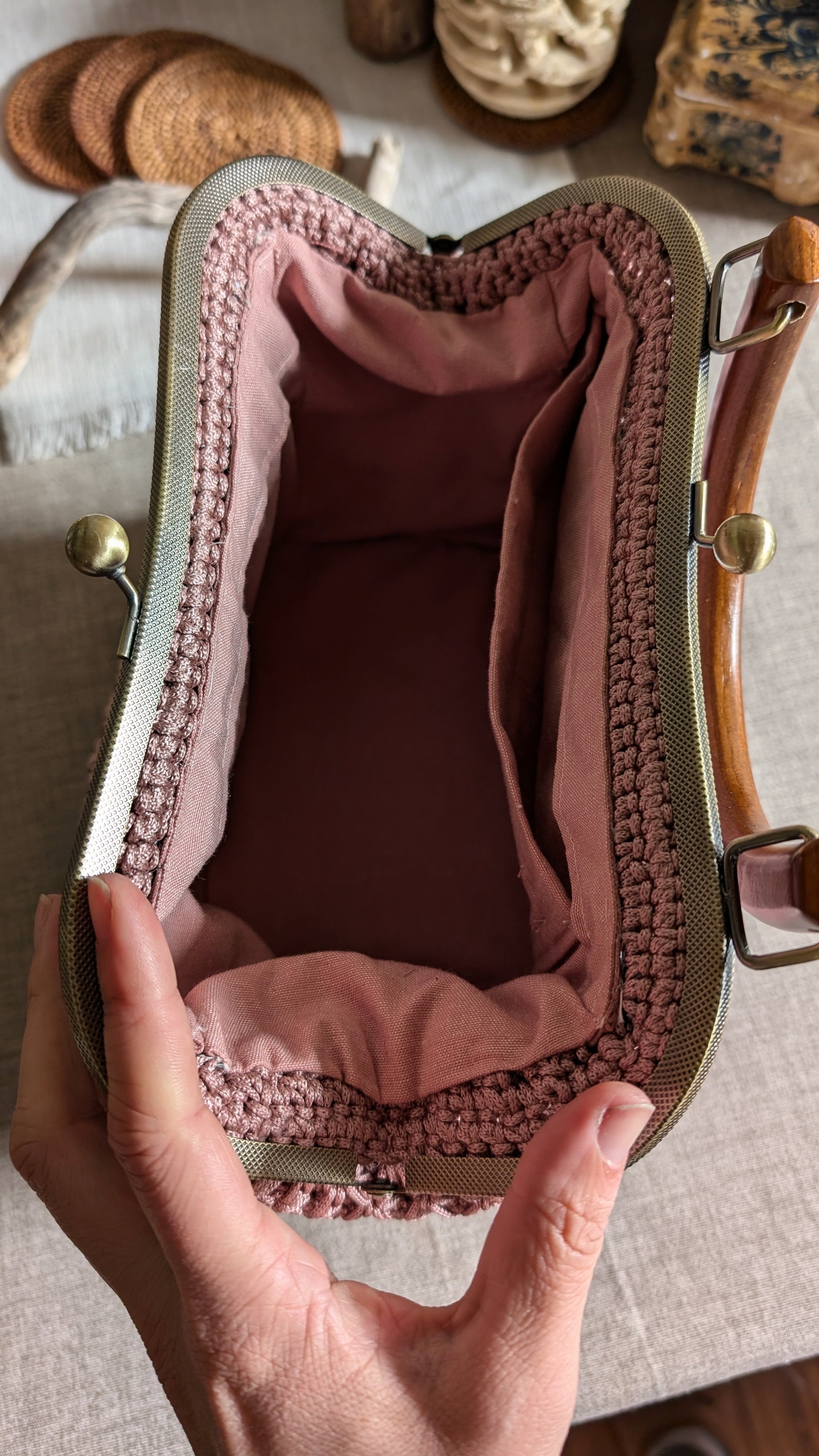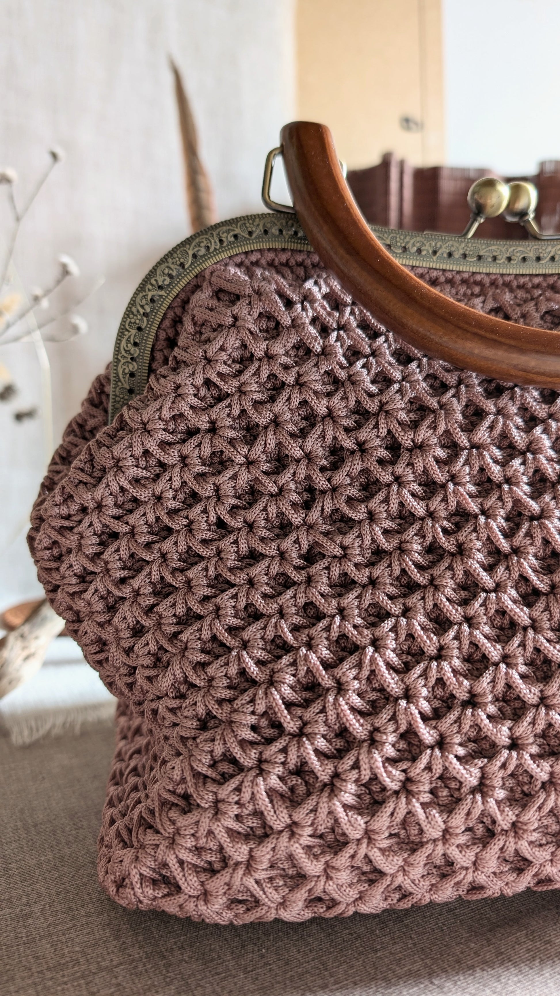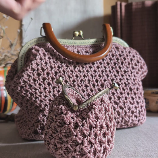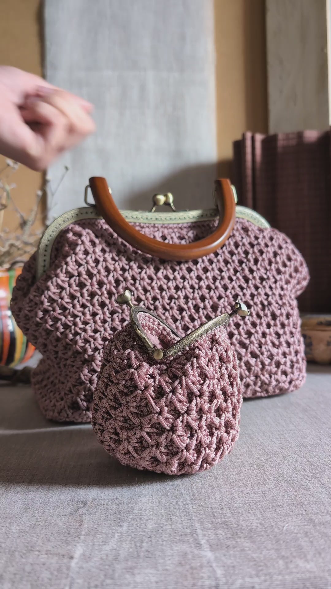 È il risultato di tante ore di lavoro artigianale partendo dalla lavorazione della parte esterna con l'apposito uncinetto e terminando con il rivestimento interno della borsa e del borsellino abbinato.