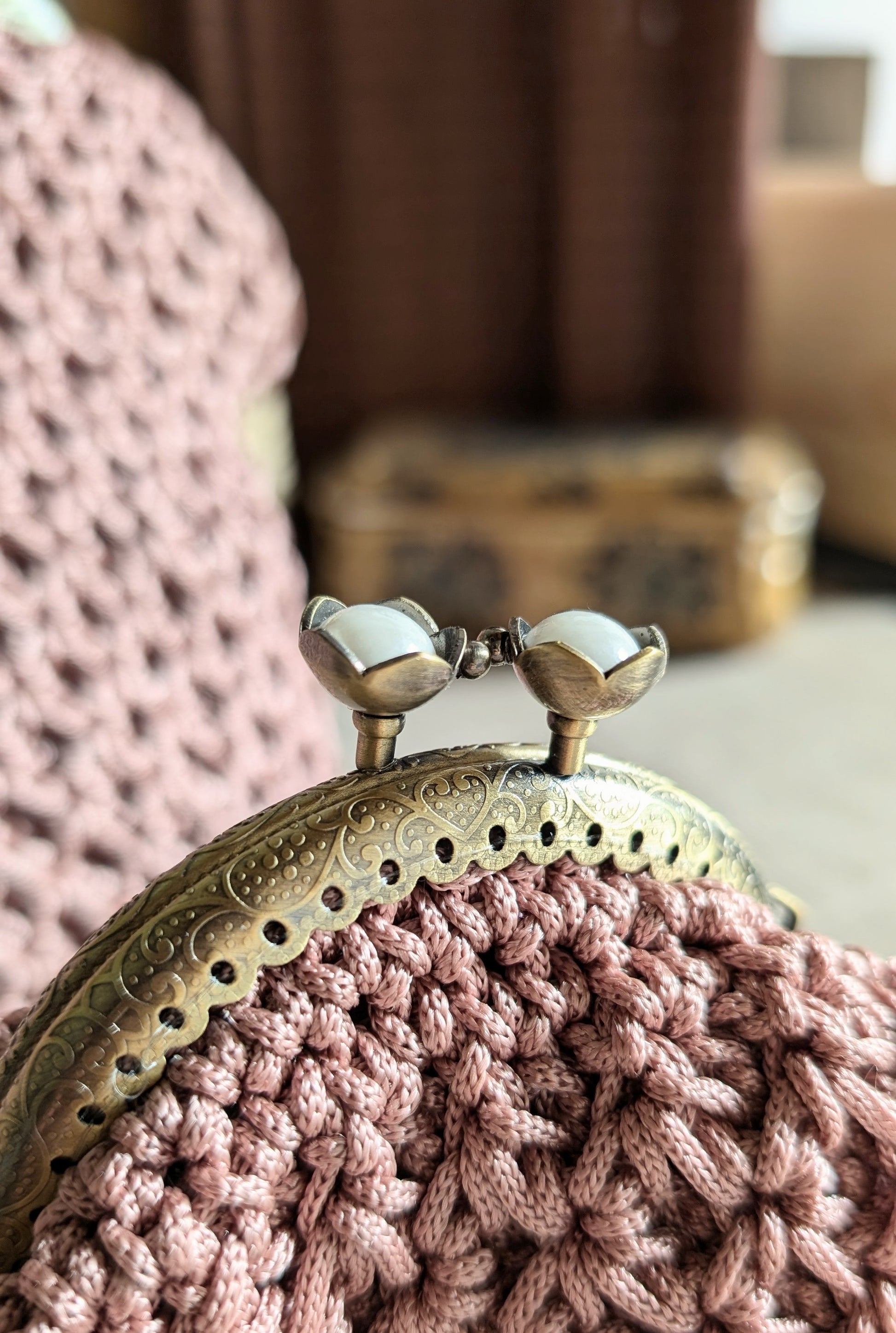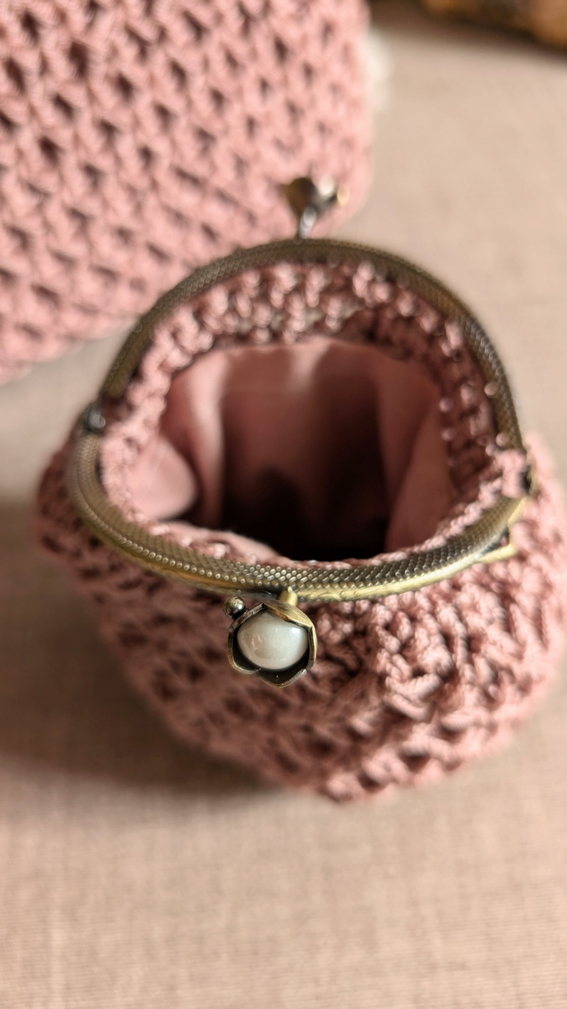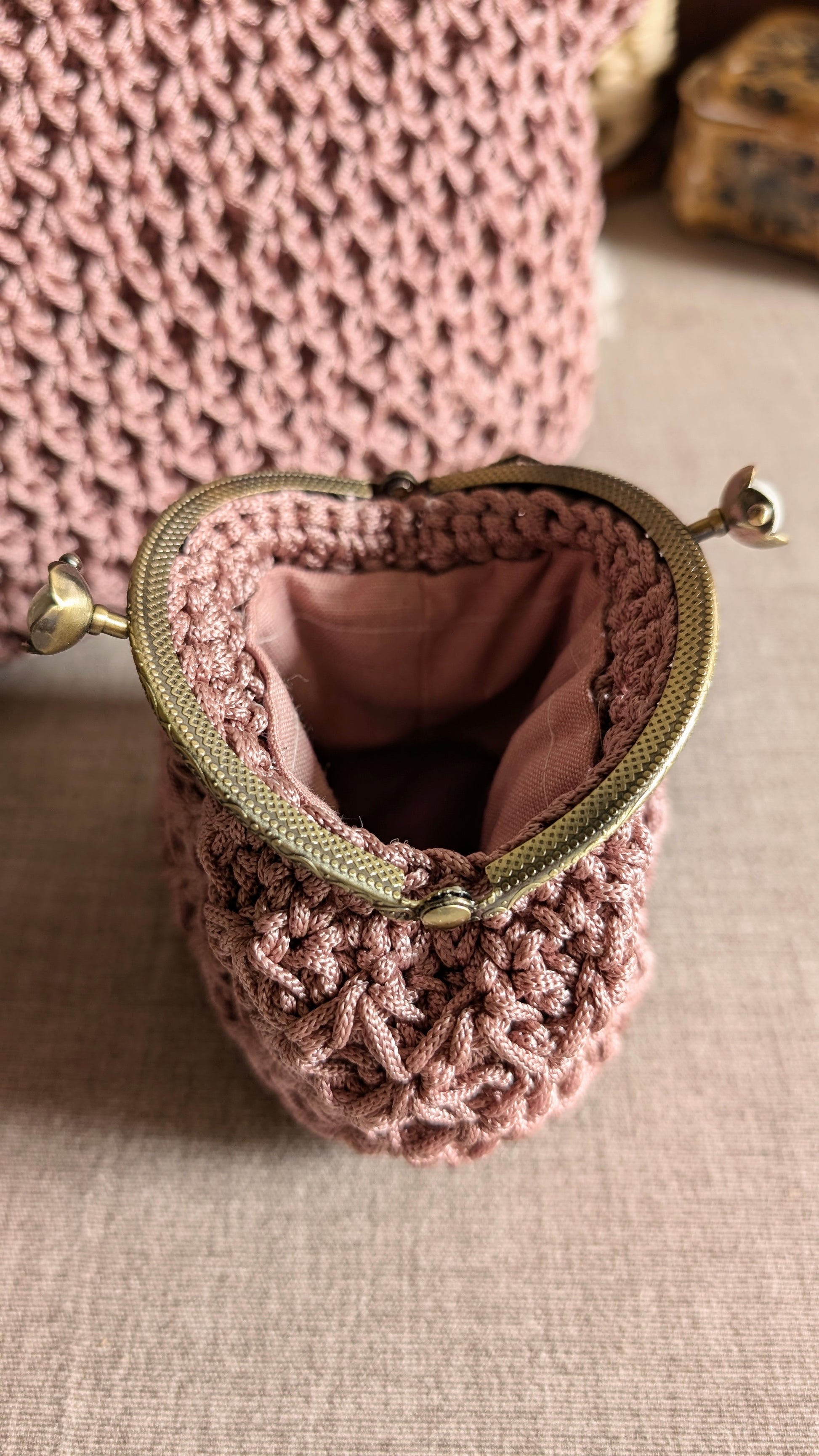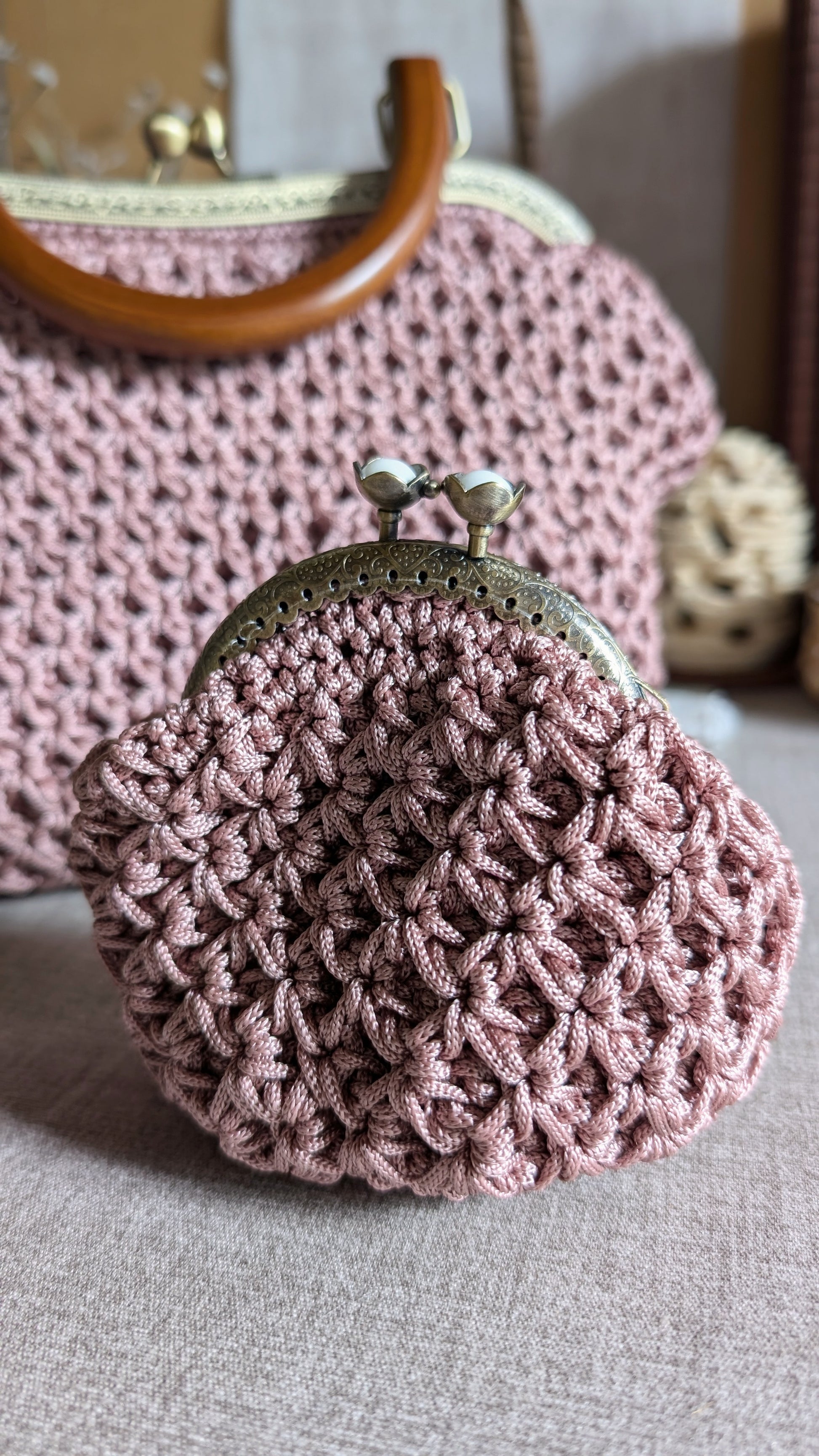 Questo set è stato prodotto all' uncinetto lavorando con un cordino lucido colore rosa anticato.