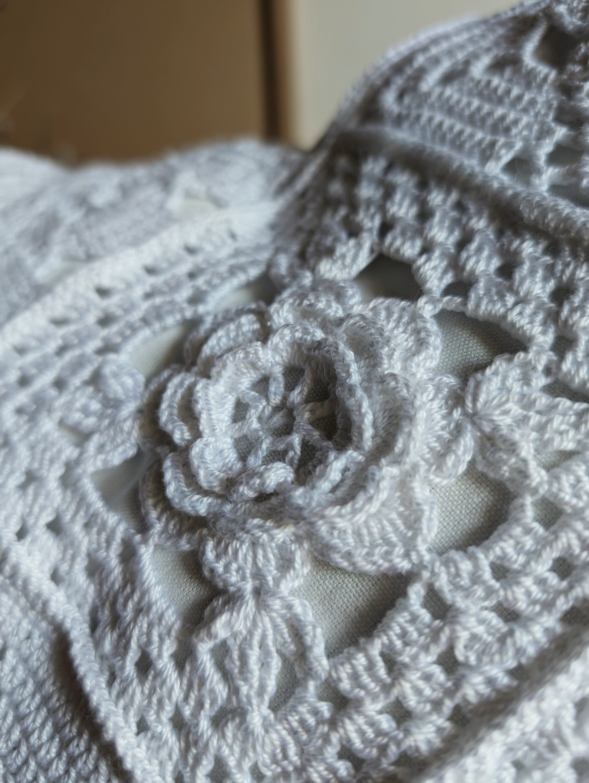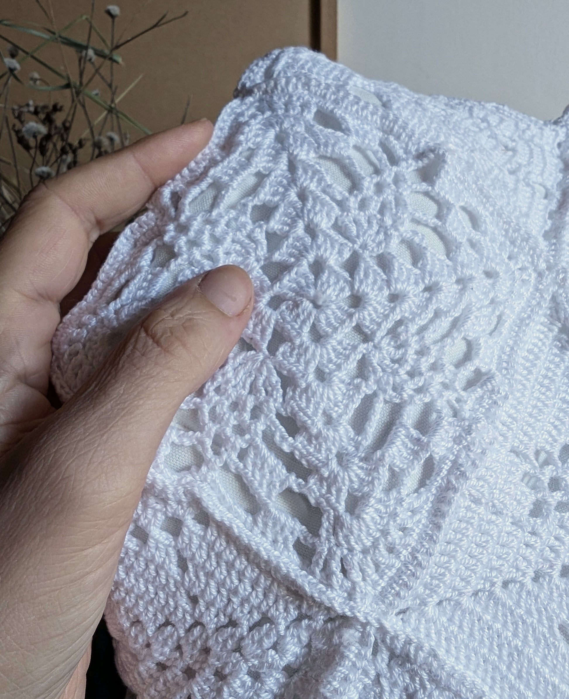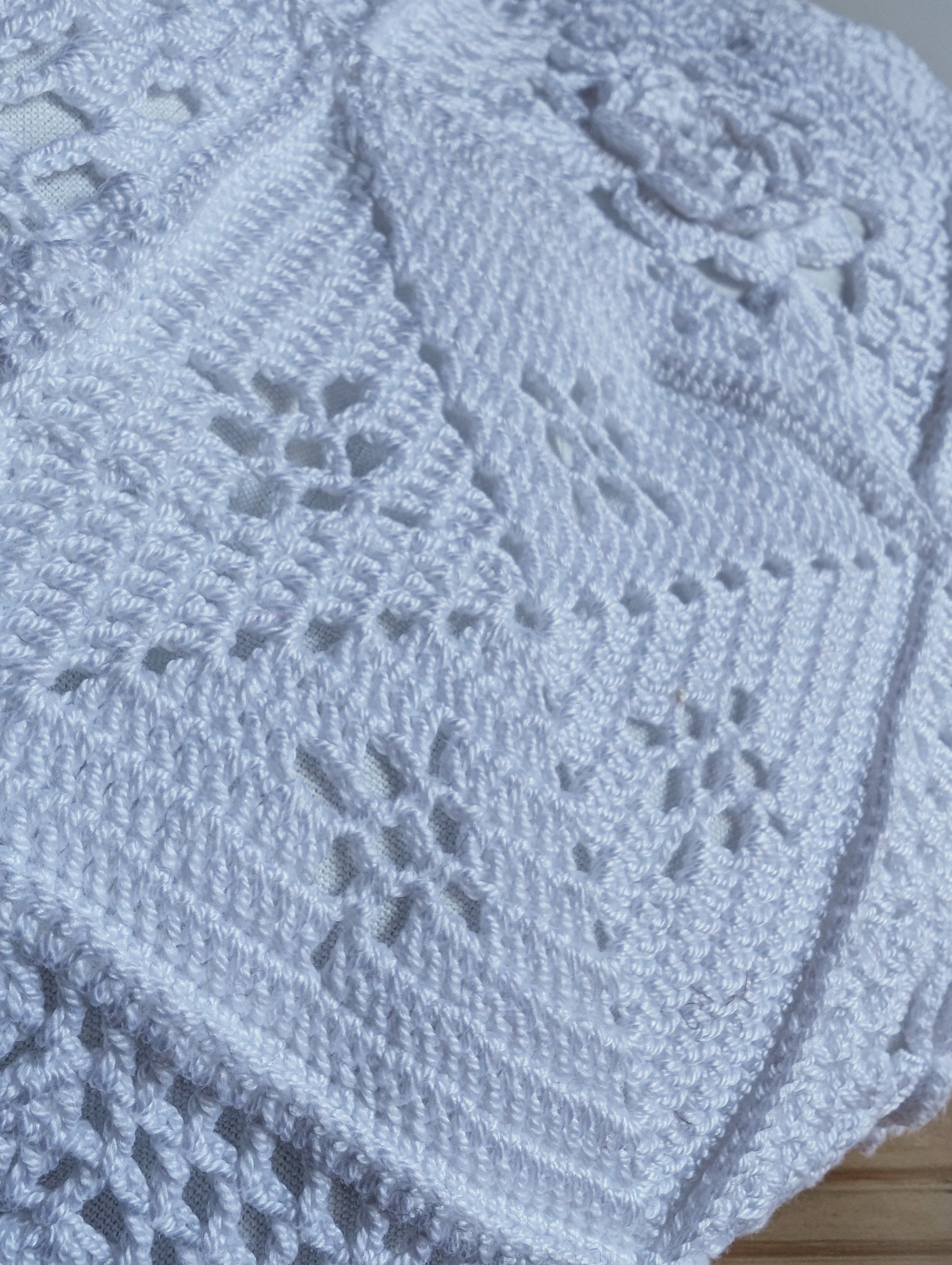 Composta da piastrelle all' uncinetto lavorate singolarmente e poi unite per un effetto patchwork dove ognuna di essa conserva la cura del dettaglio.