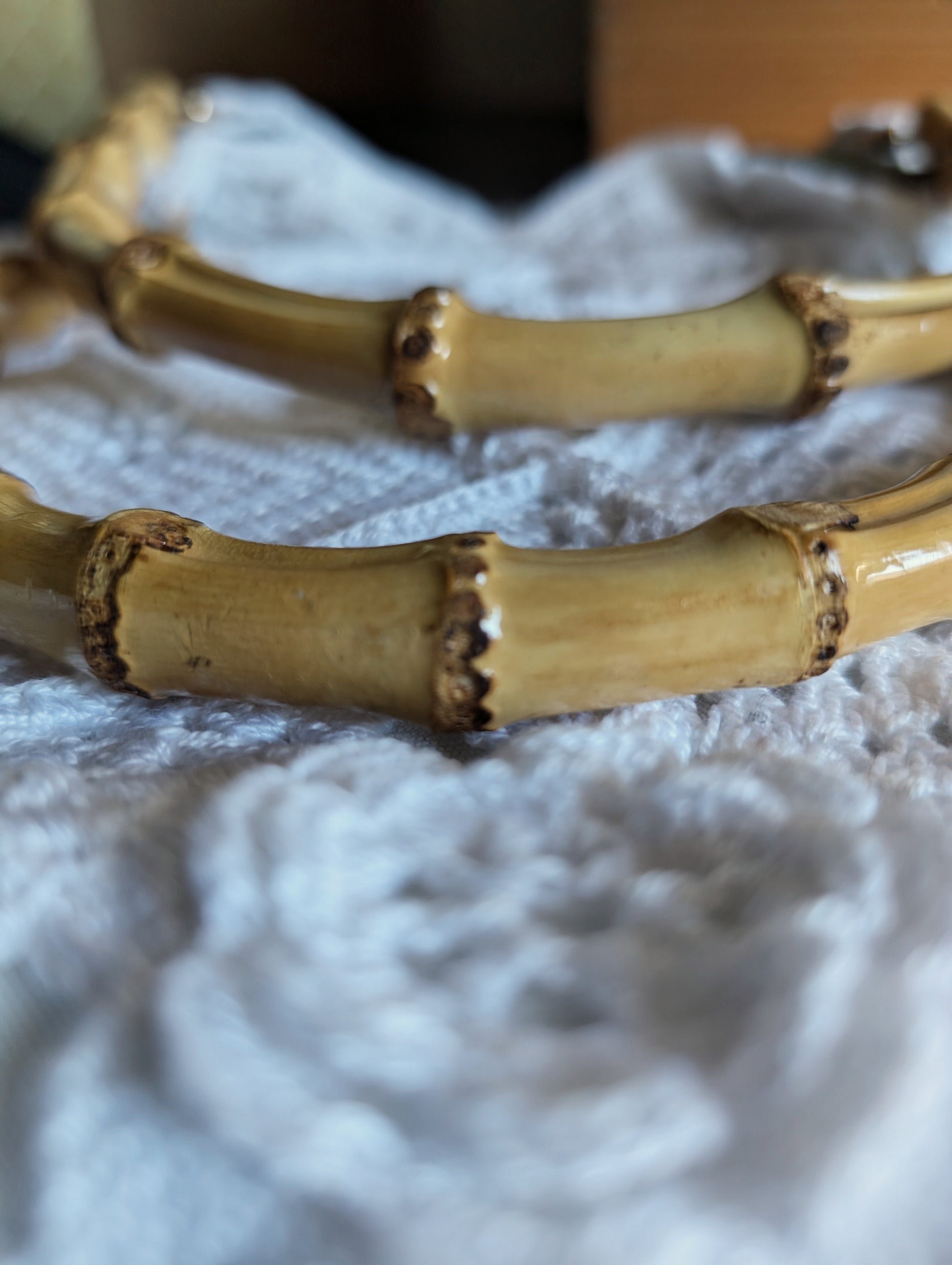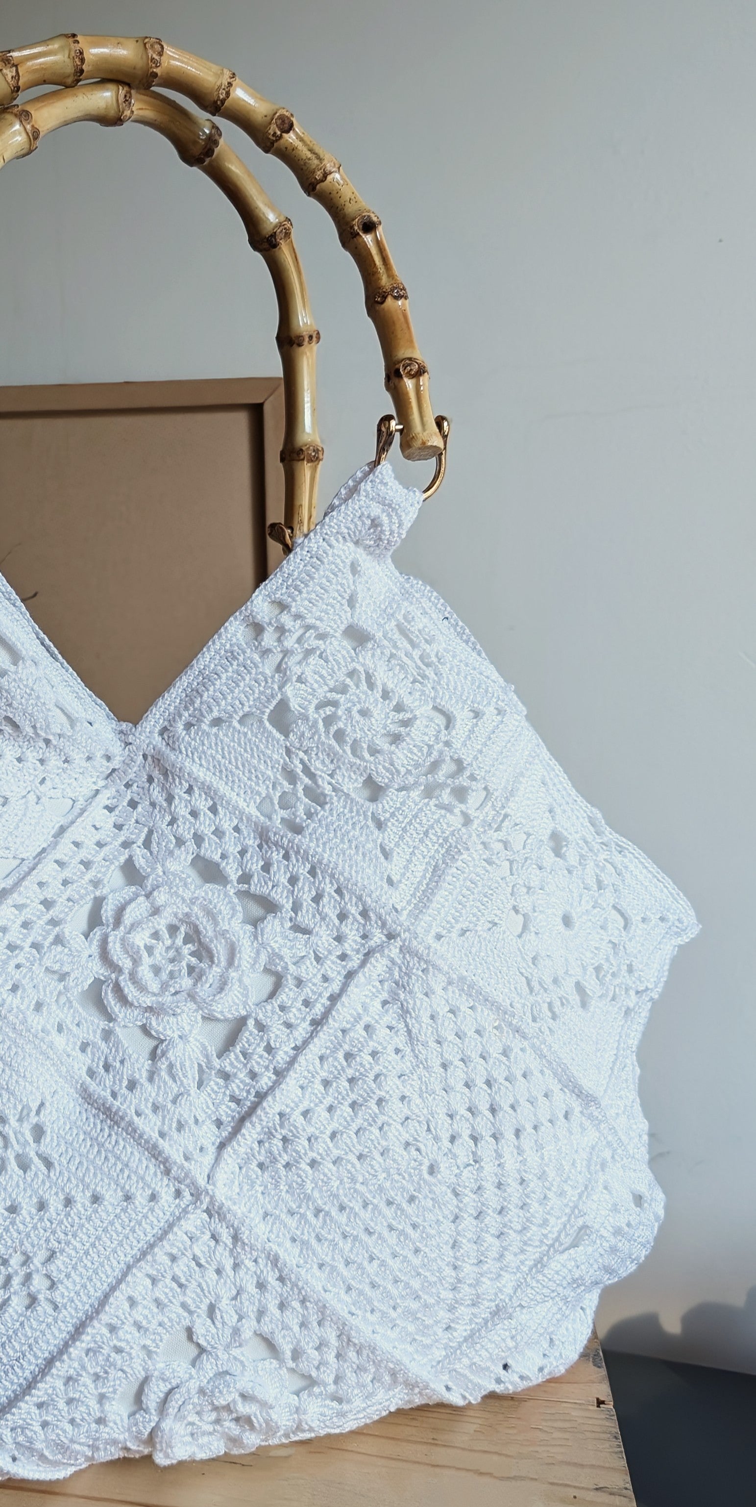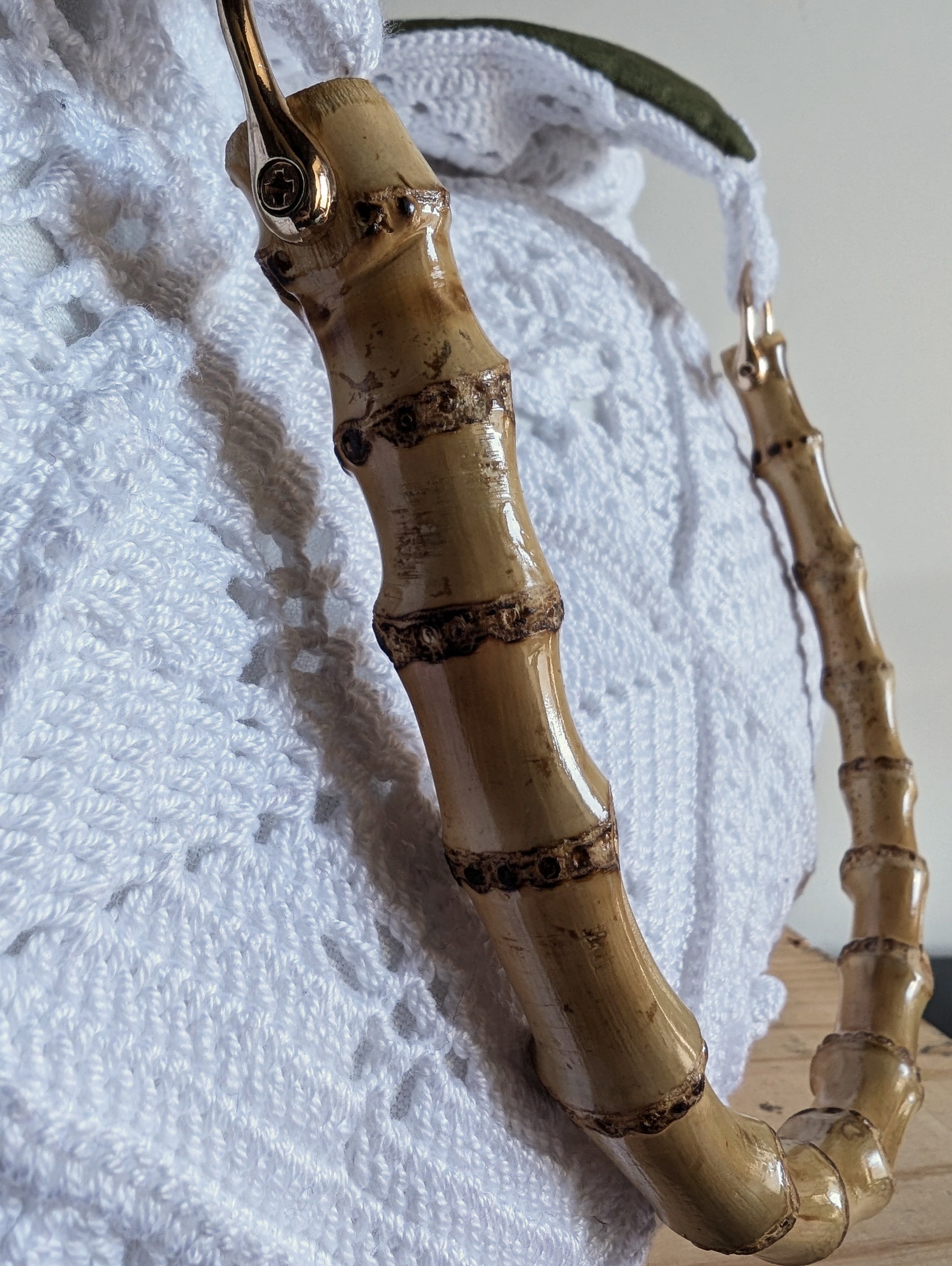 Borsa all' uncinetto fatta a mano con manici rigidi in bamboo che conferiscono un' aspetto naturale.