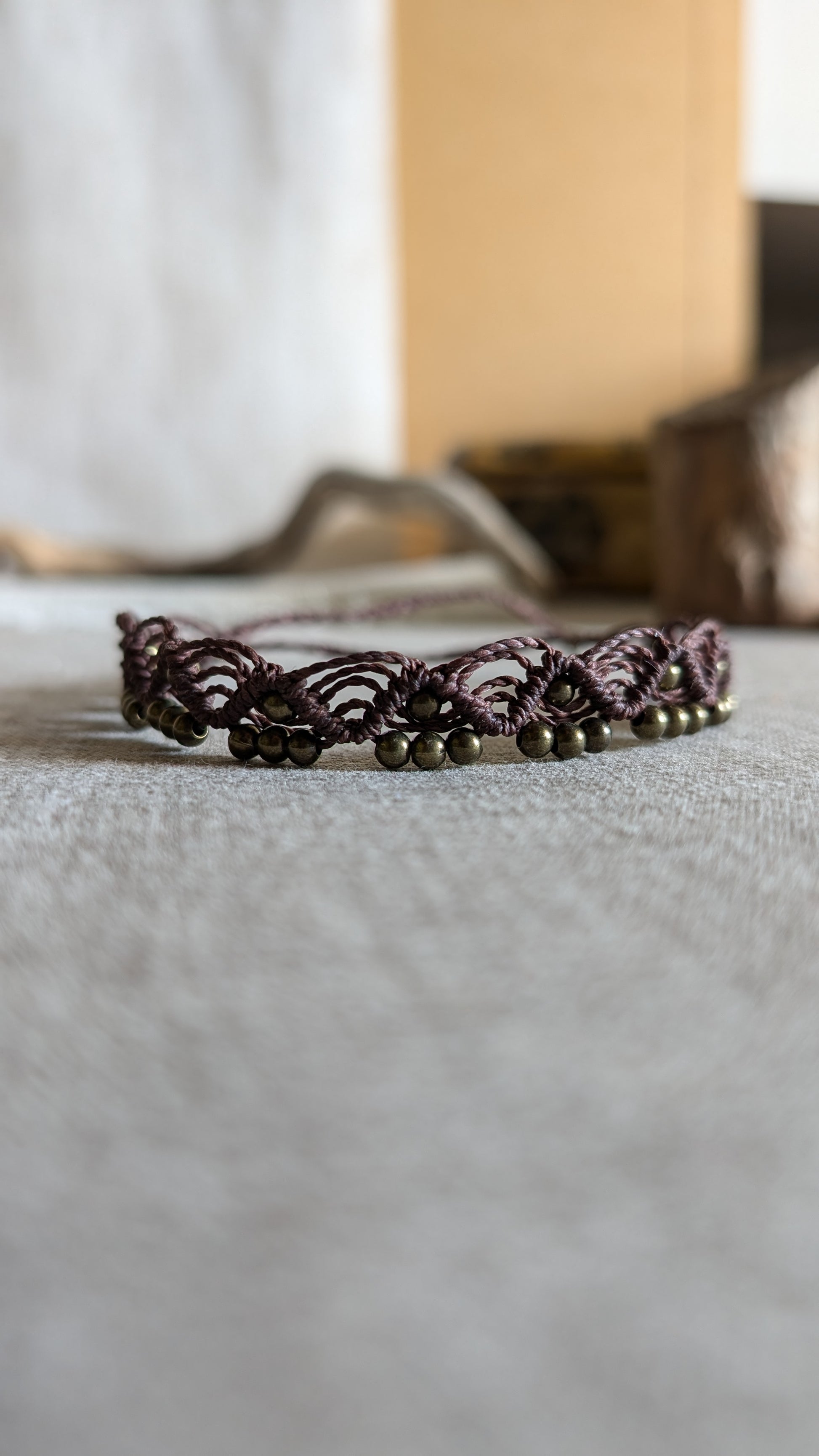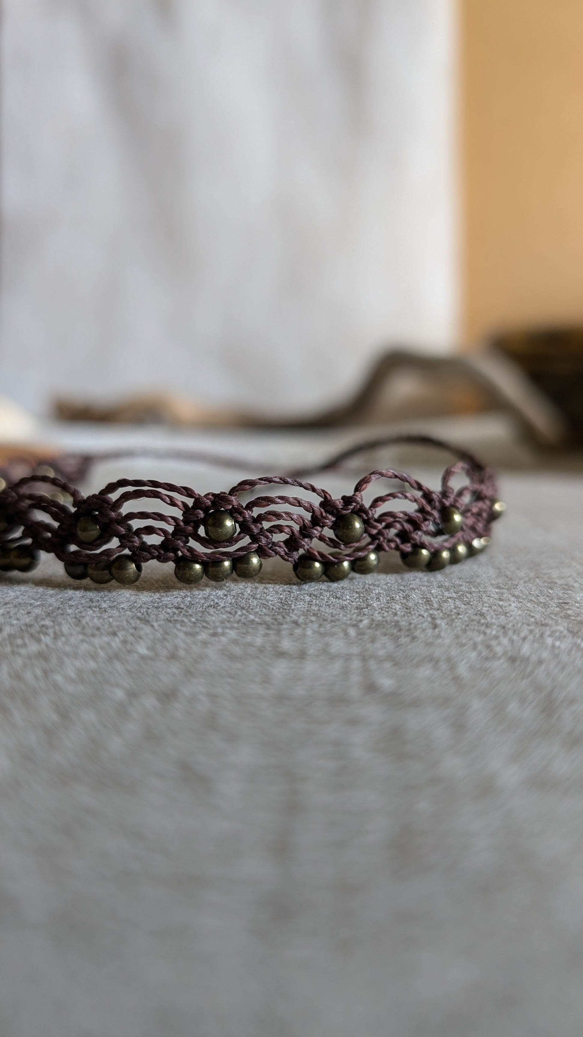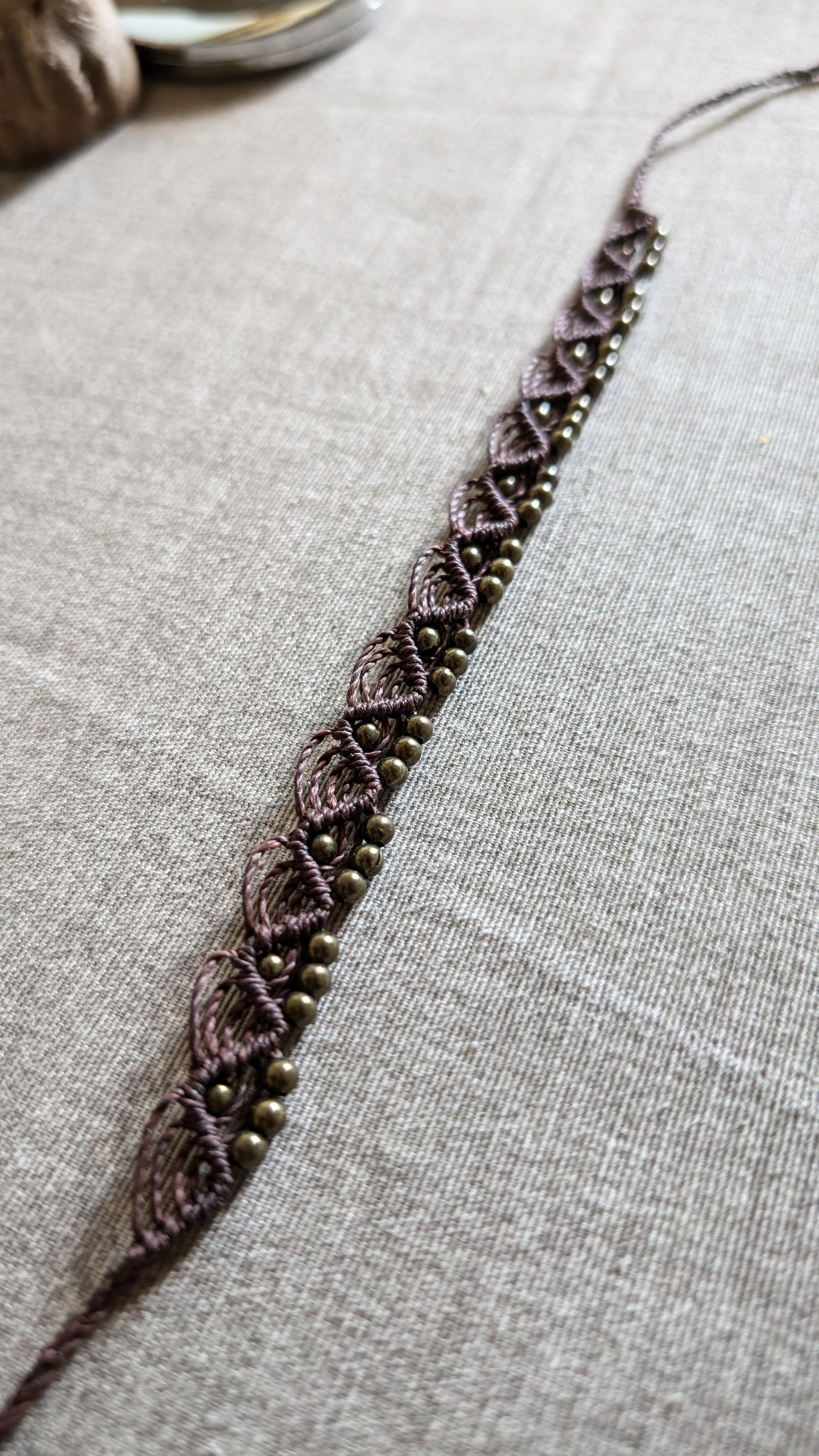 Cavigliera fatta a mano in micro macramè con perline color bronzo.