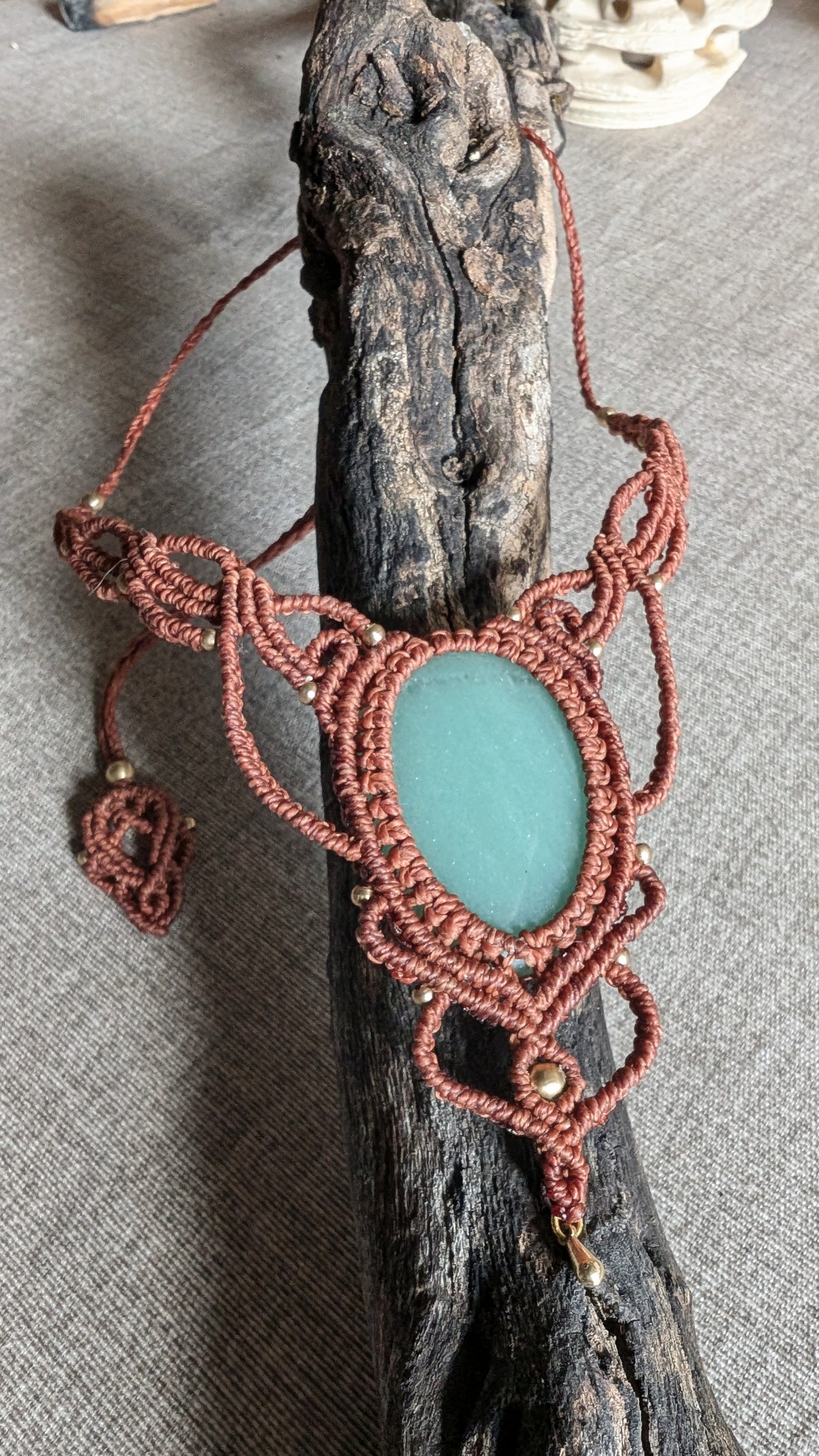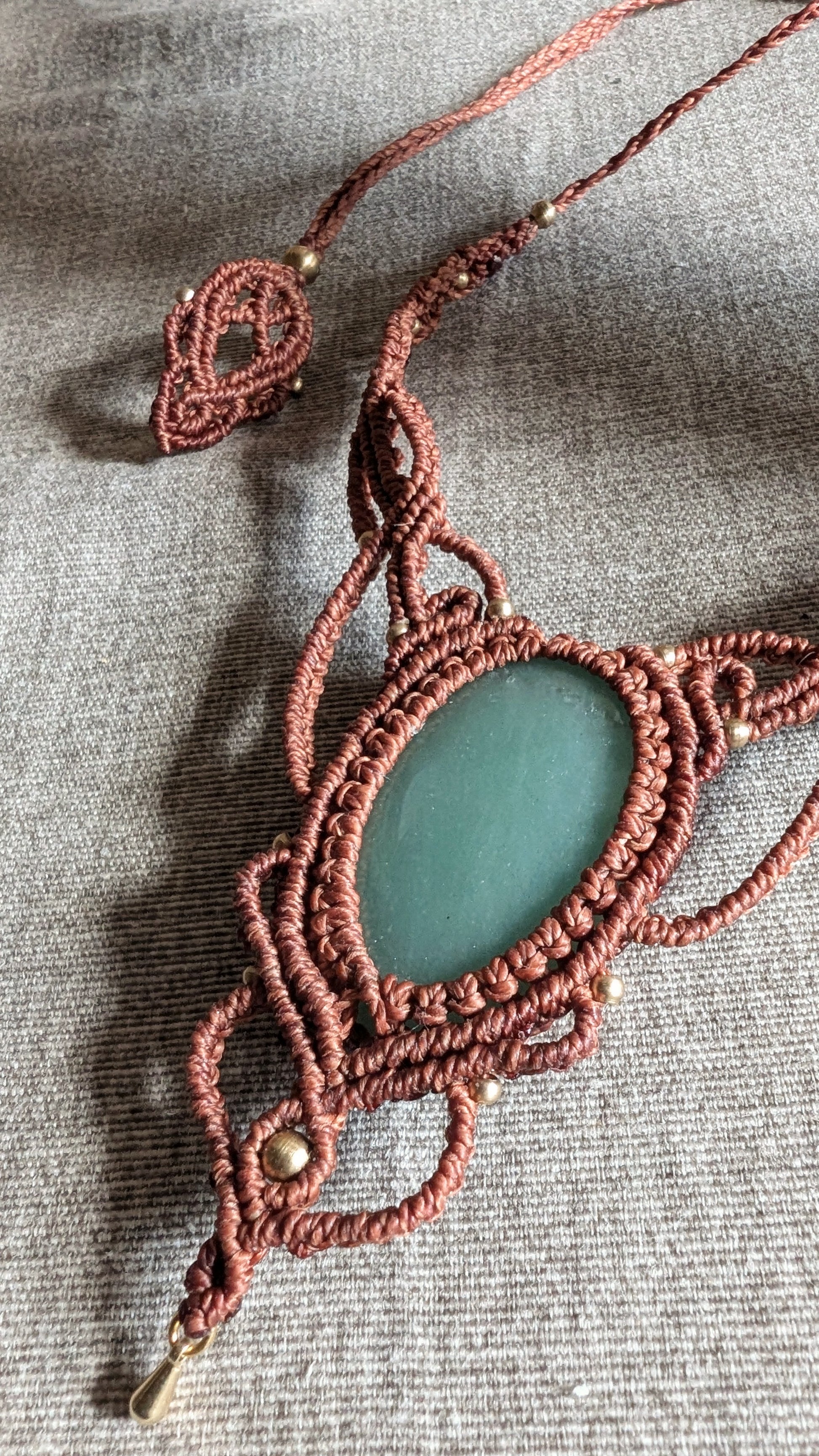 Splendida collana a girocollo interamente intrecciata a mano con pietra avventurina e perline in ottone.