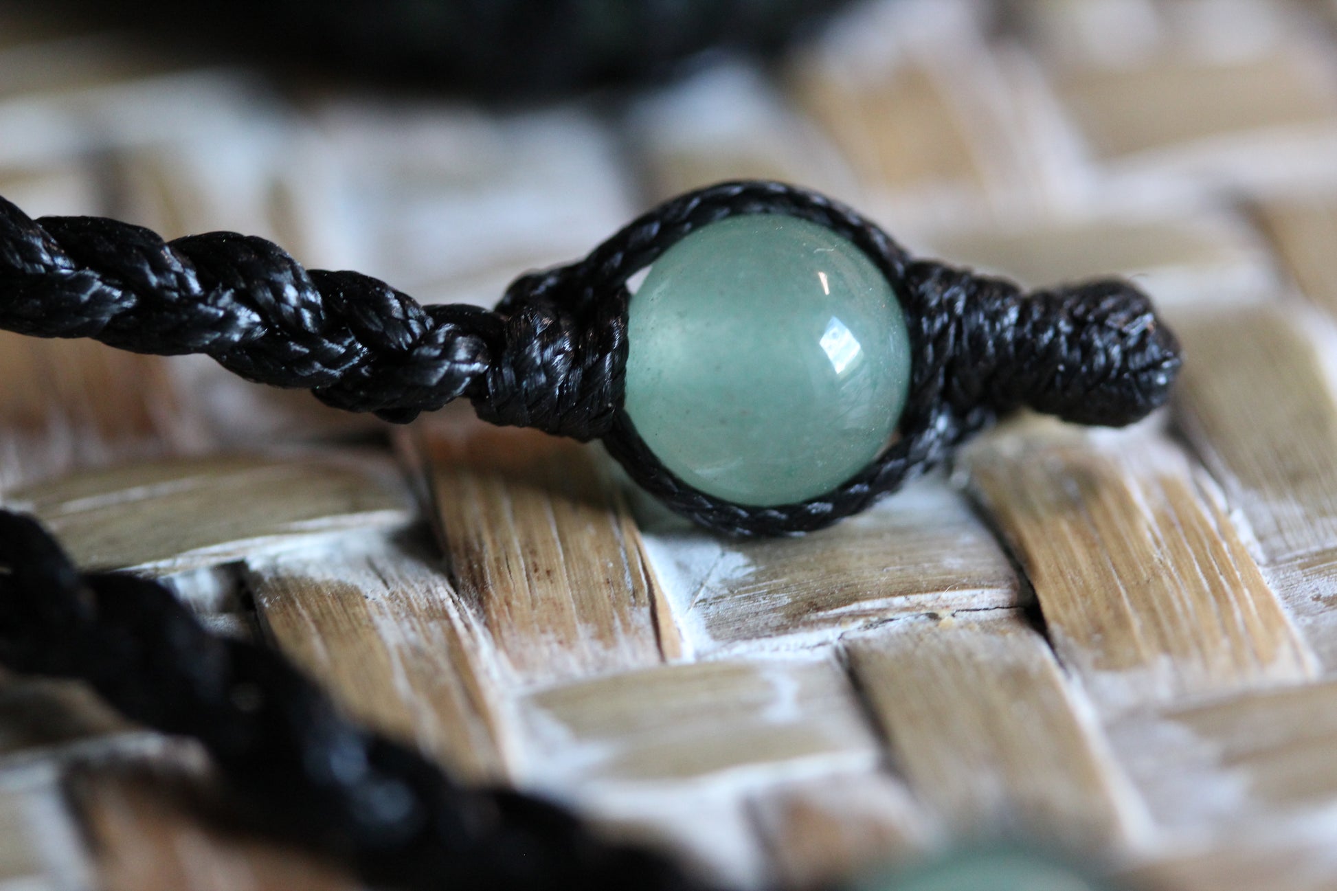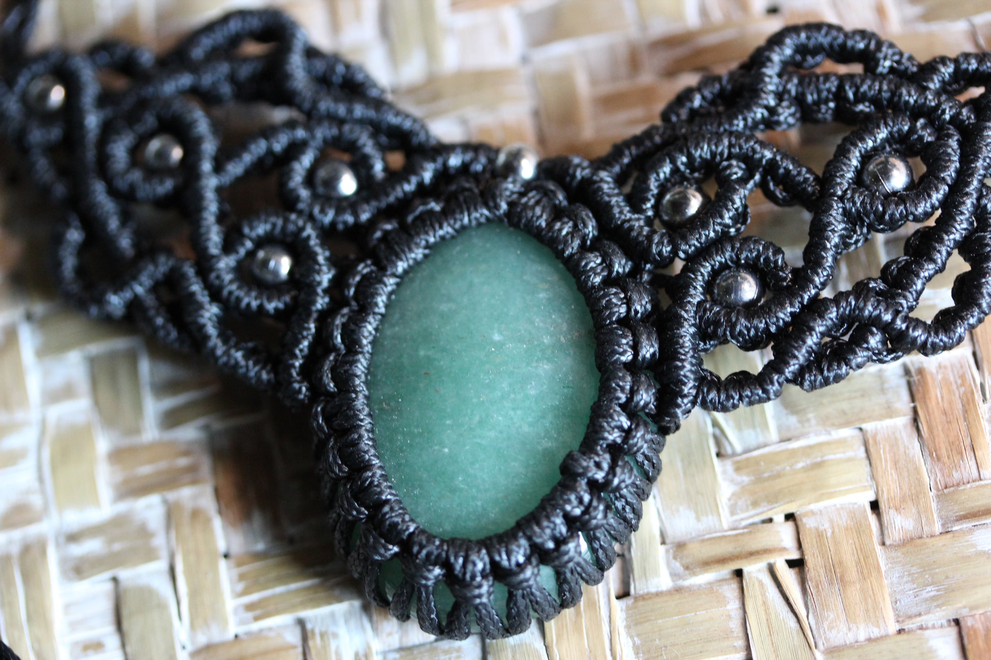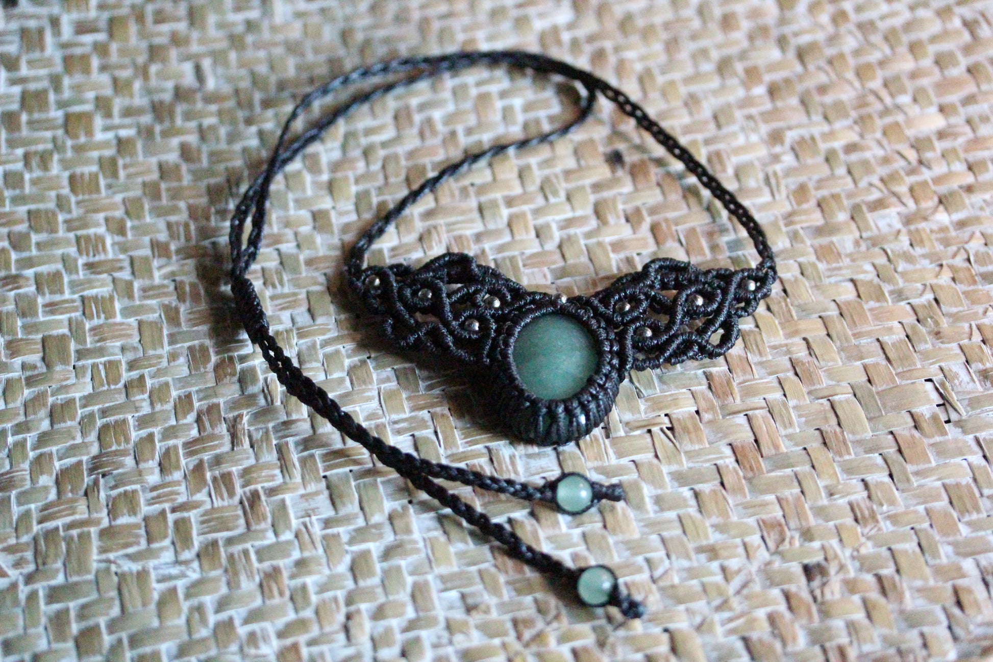Una collana a girocollo in micro macramè adatta ad ogni occasione. Prodotta interamente a mano con incastonata un' avventurina, pietra naturale simbolo di storie antiche.