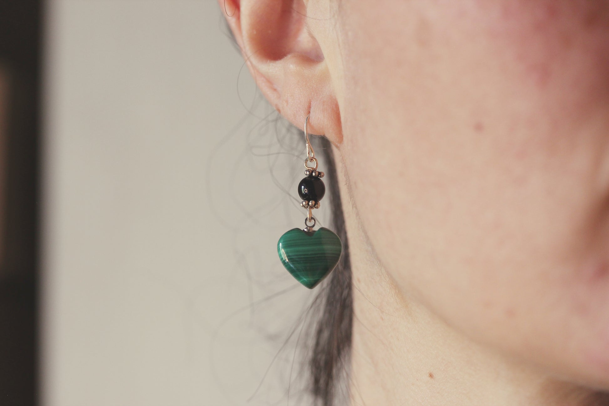 Orecchini prodotti con pietra malachite a forma di cuore e perla onice nera.