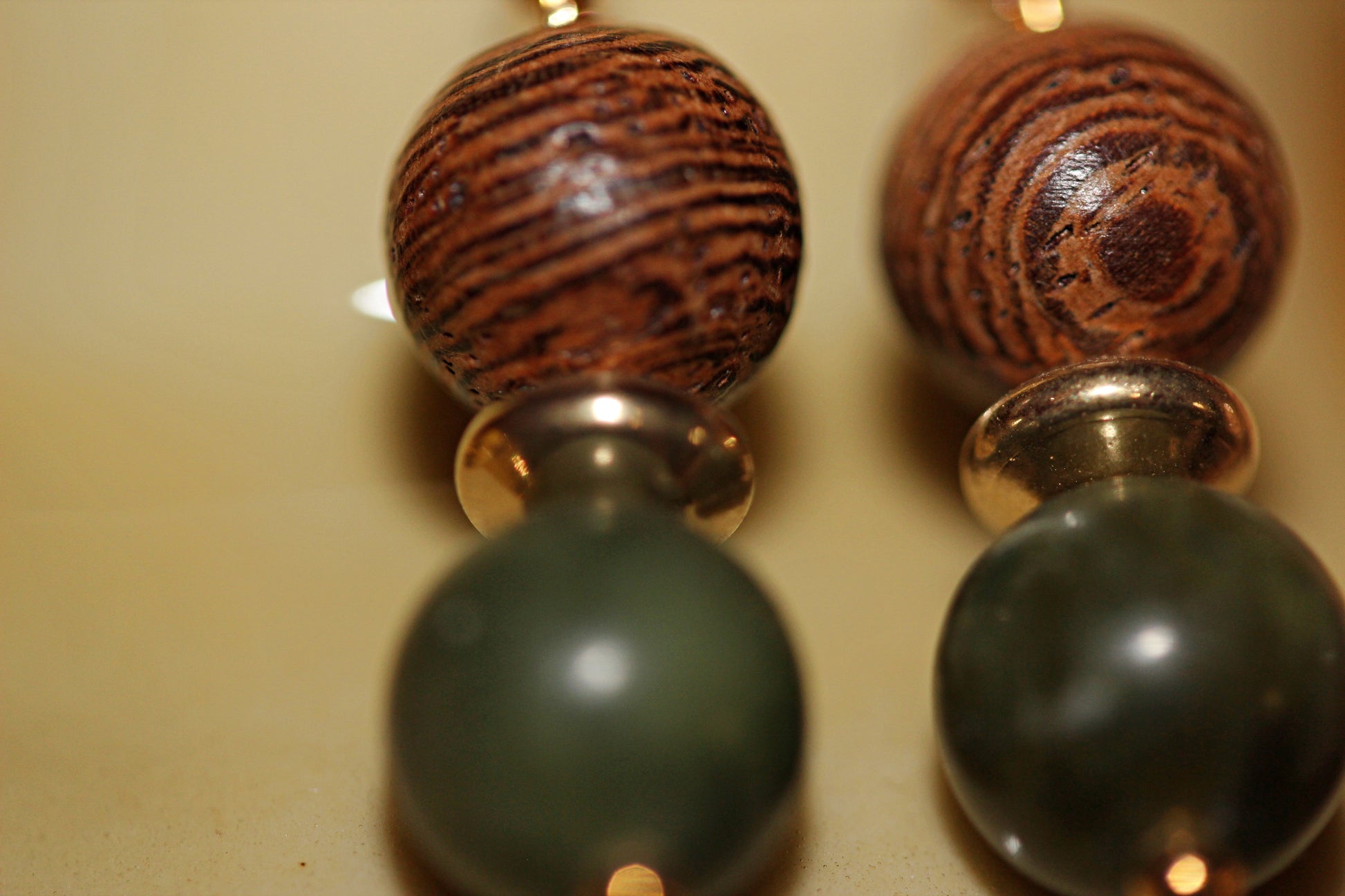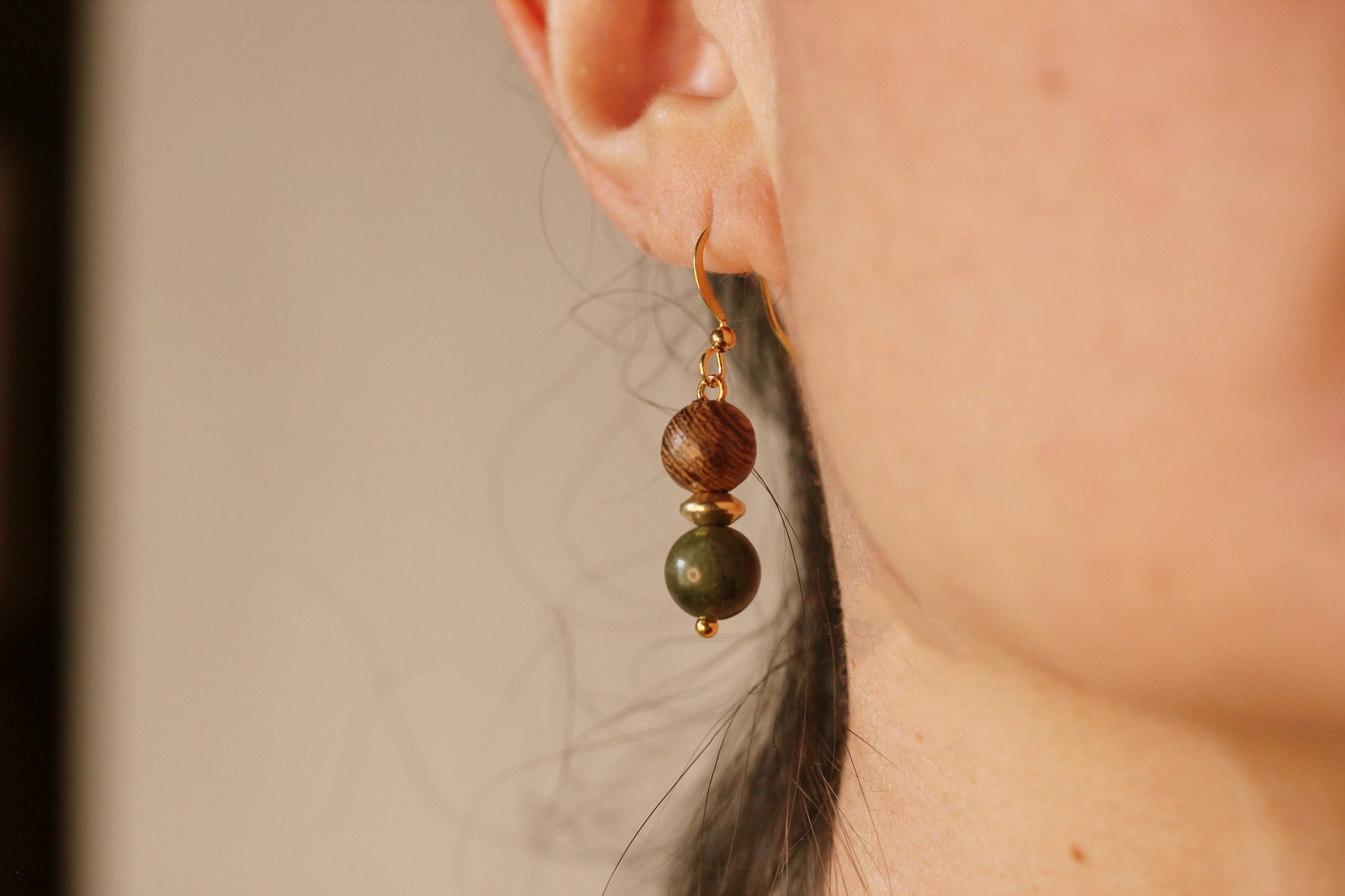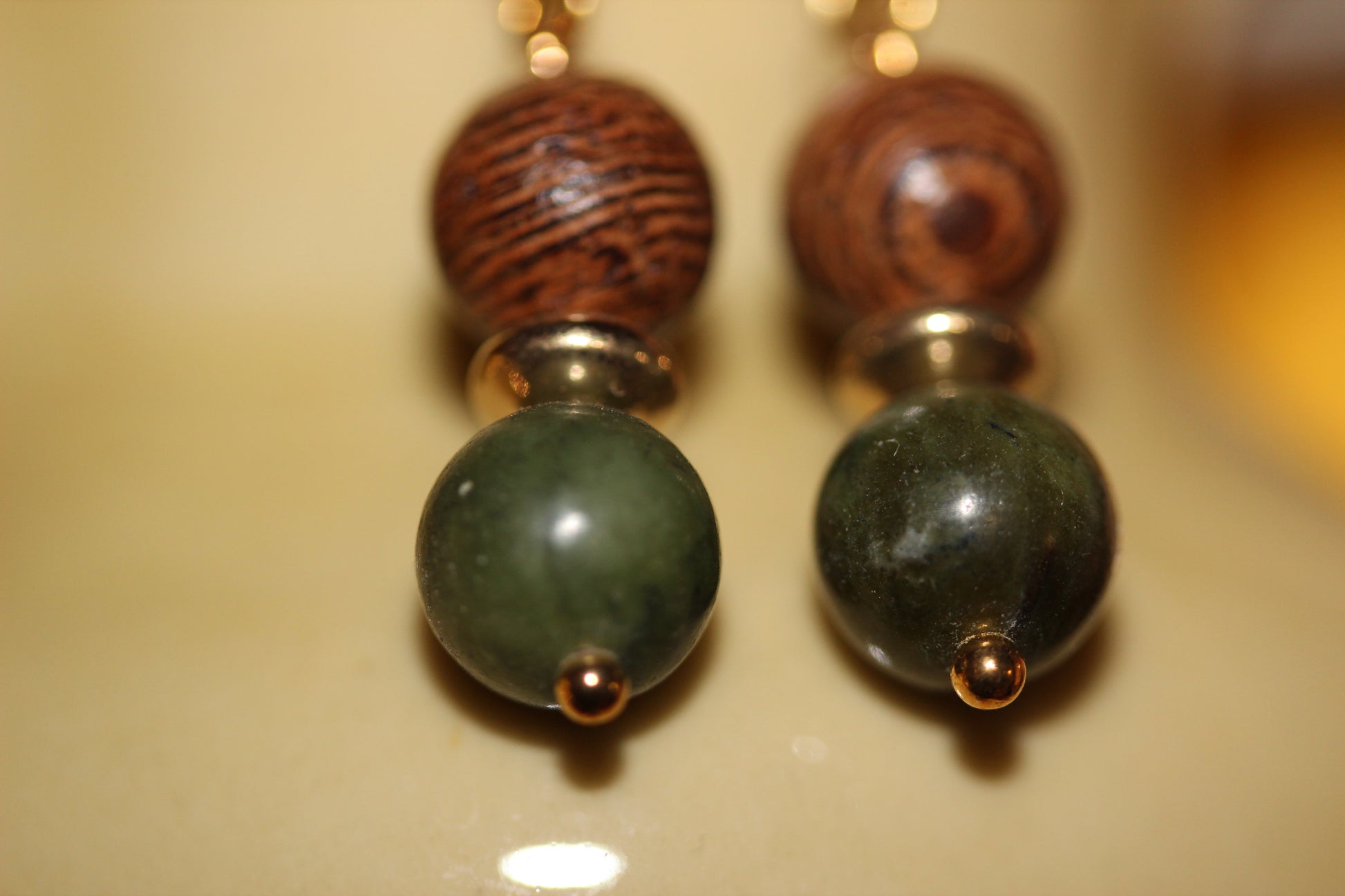 La seconda versione degli orecchini Pakal prodotti sempre con perla in pietra di giada e legno.