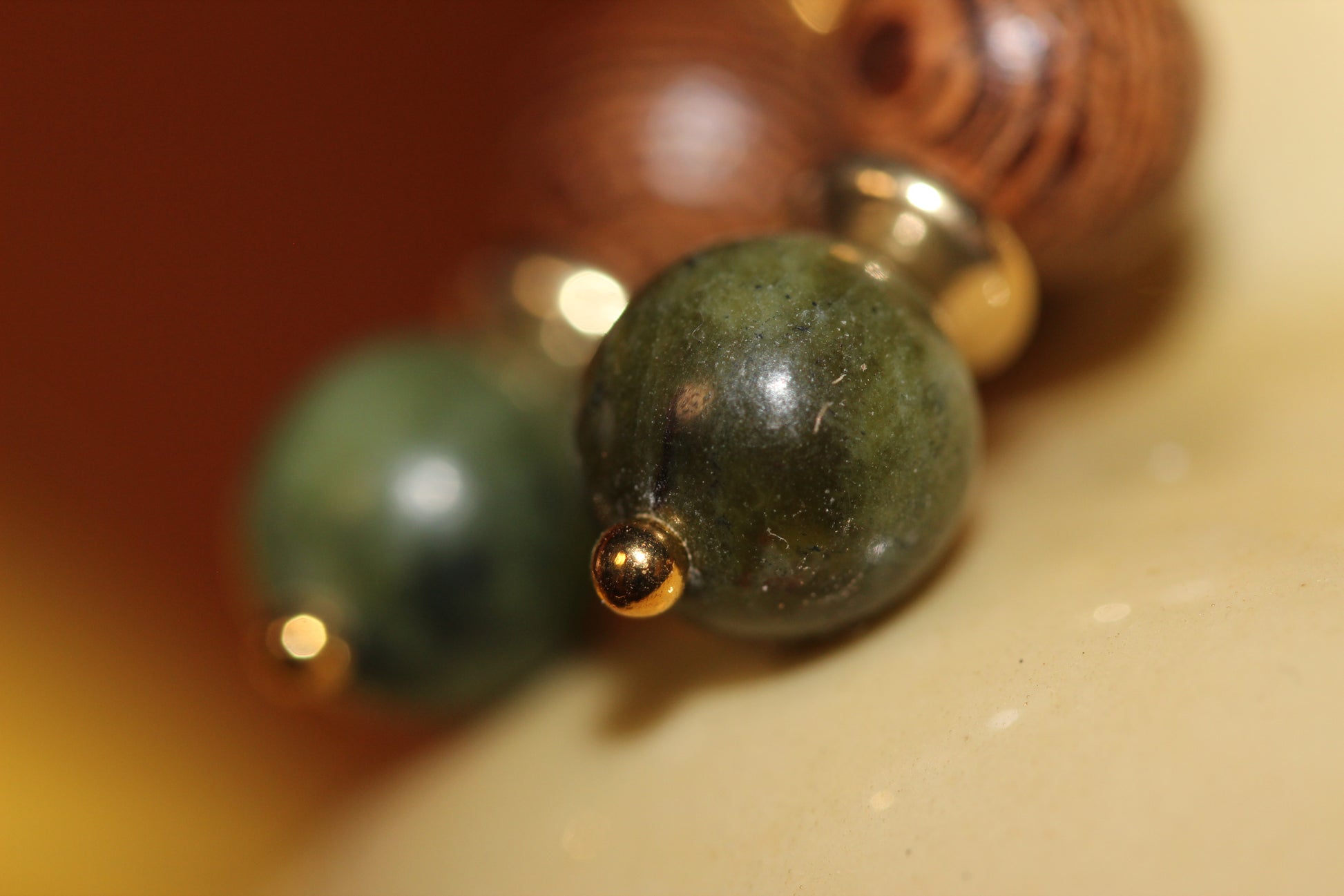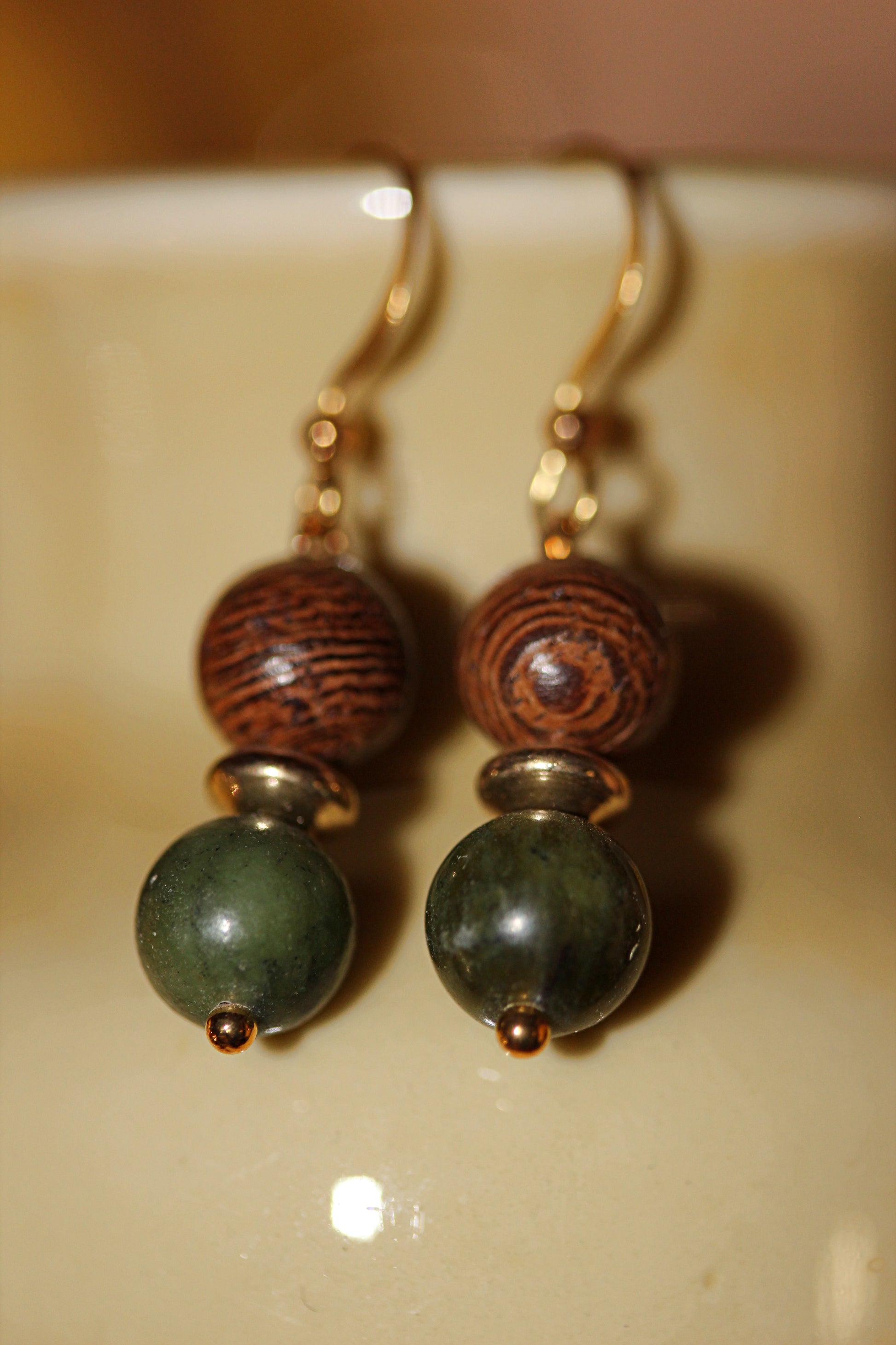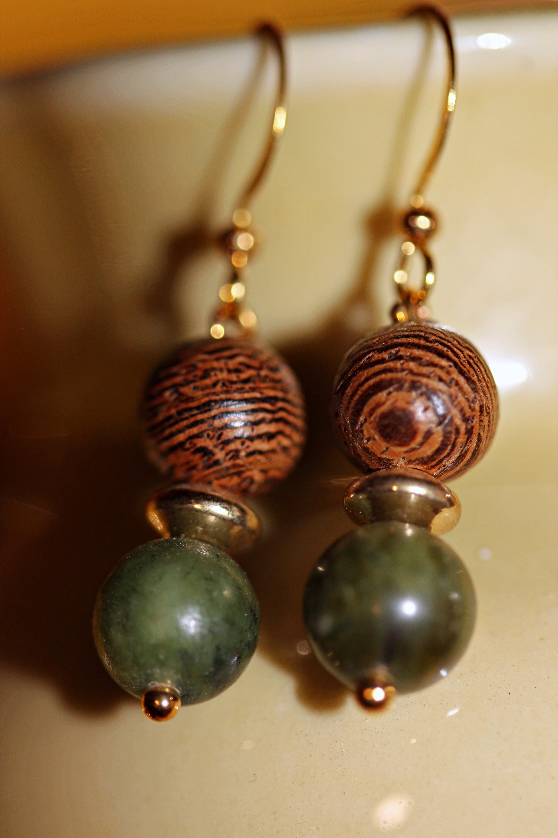 La seconda versione degli orecchini Pakal prodotti sempre con perla in pietra di giada e legno.