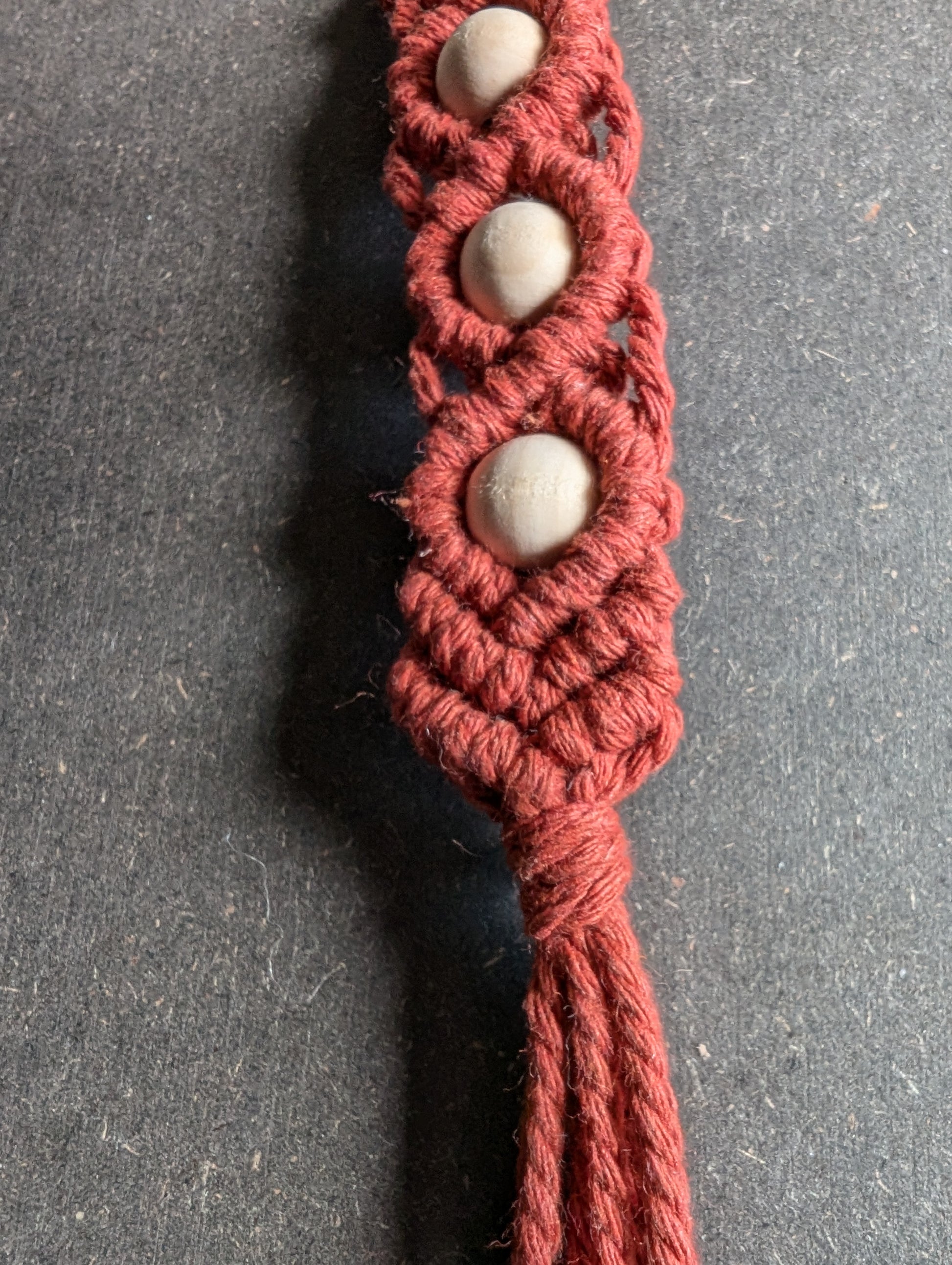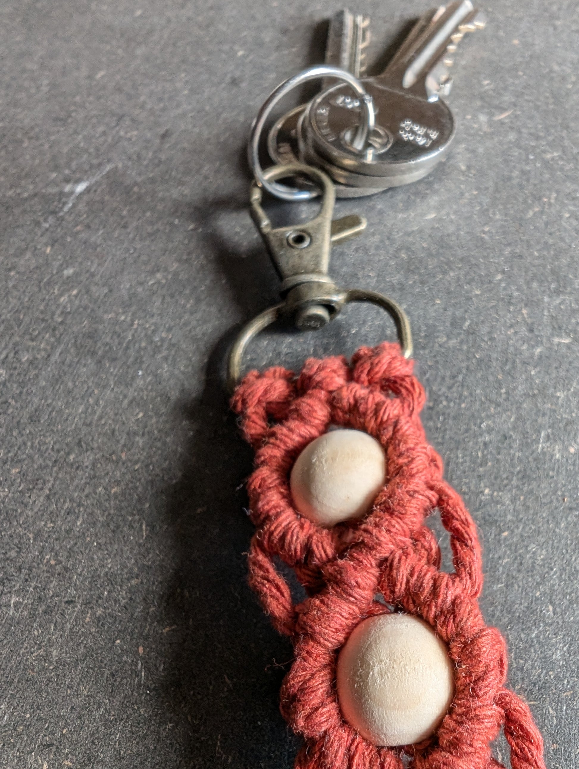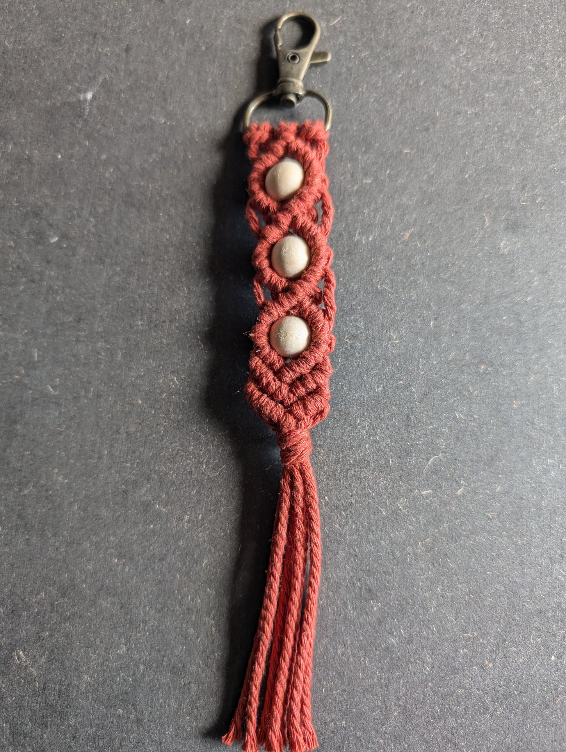 Portachiavi in macramè fatto a mano di colore arancione con gancio color bronzo antico.