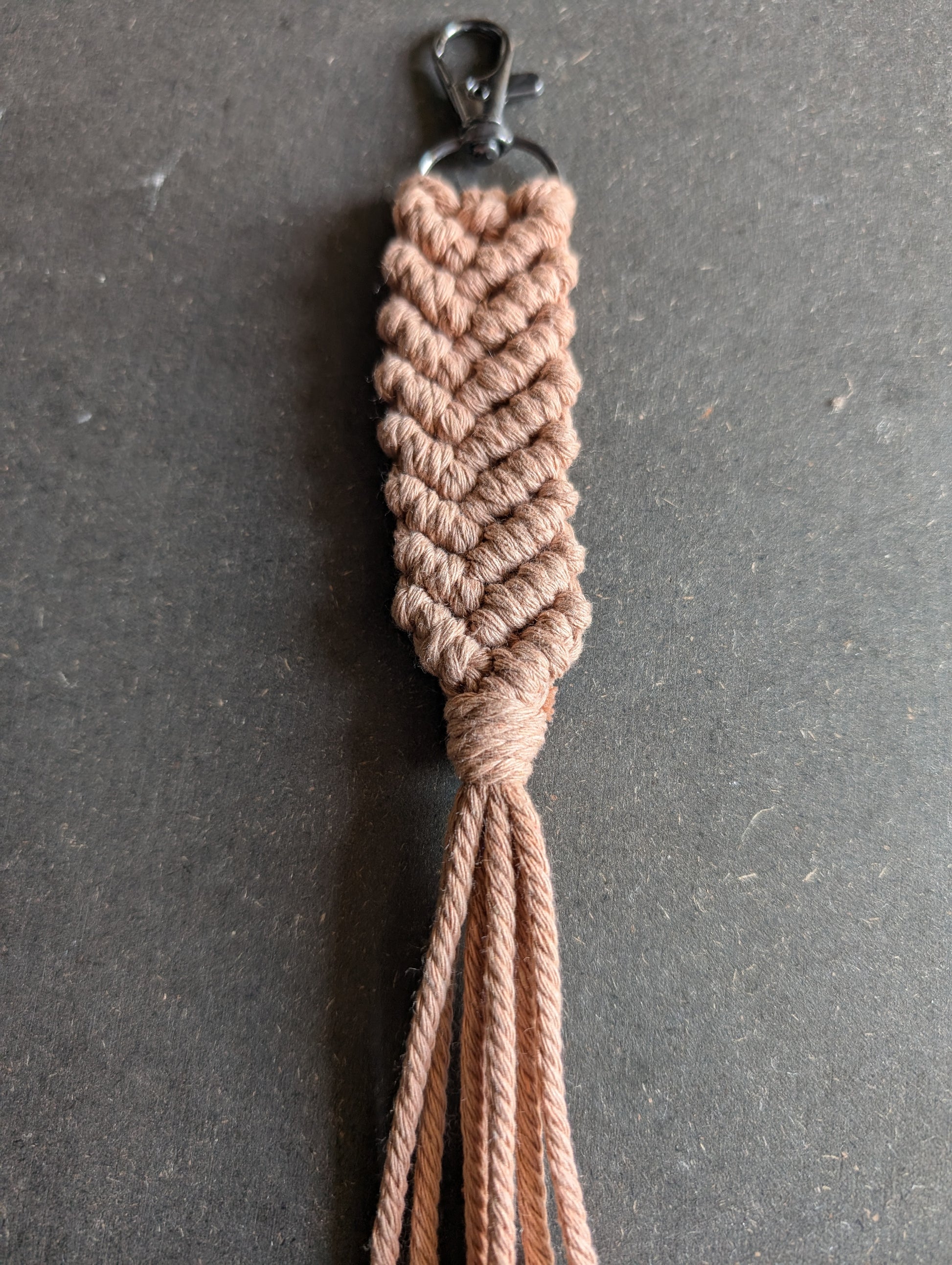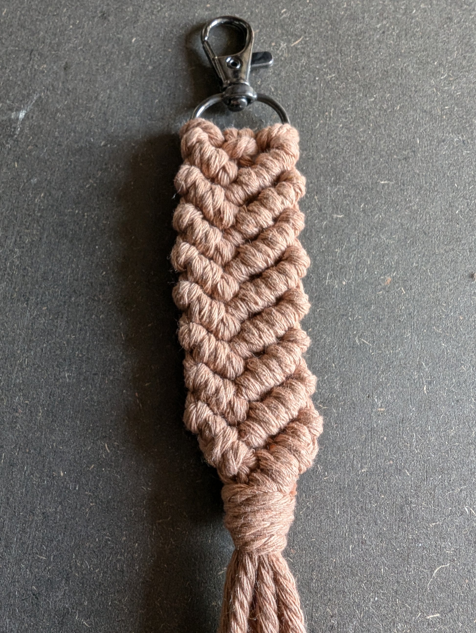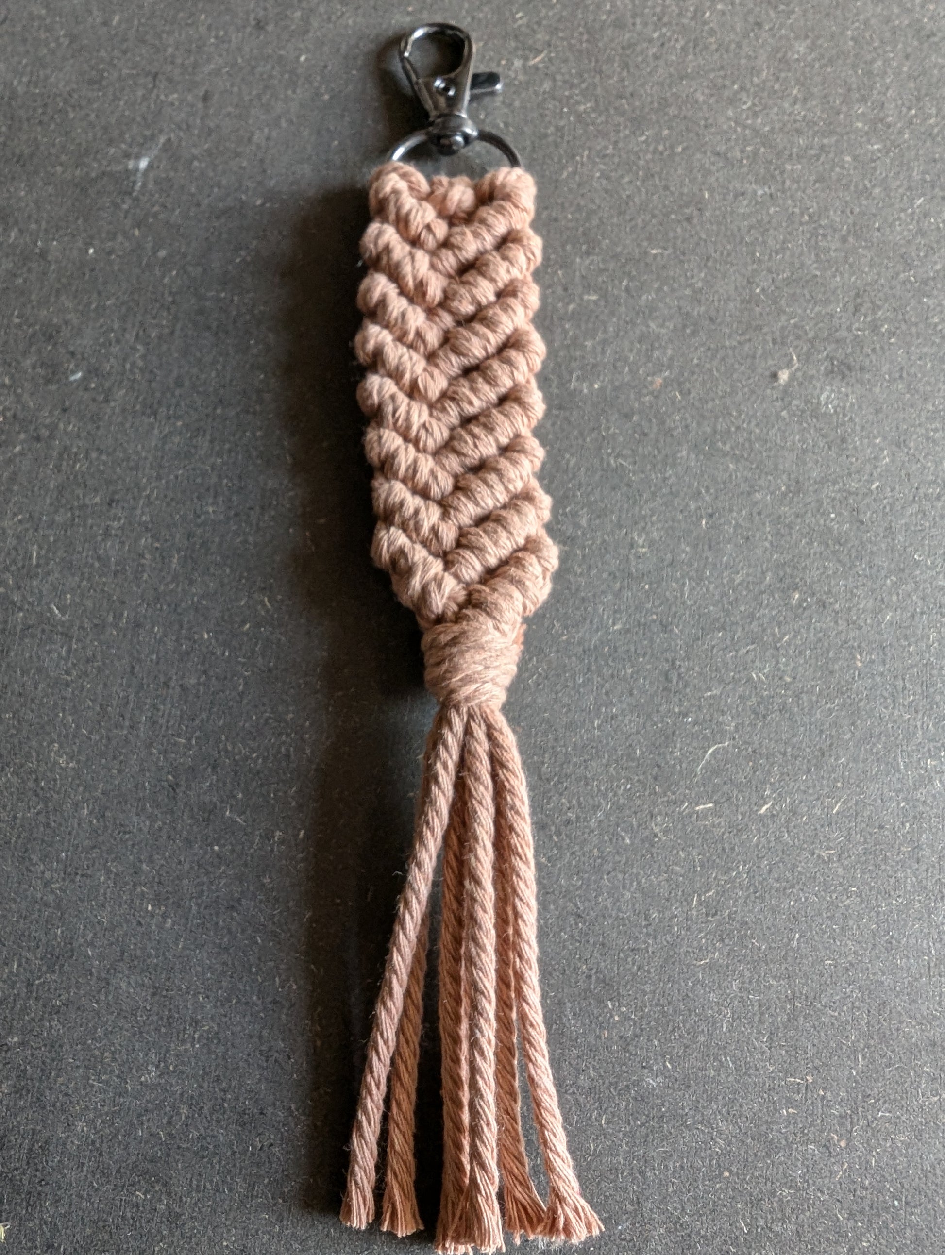 Portachiavi in macramè fatto a mano, colore rosa con gancio color nero titanio.