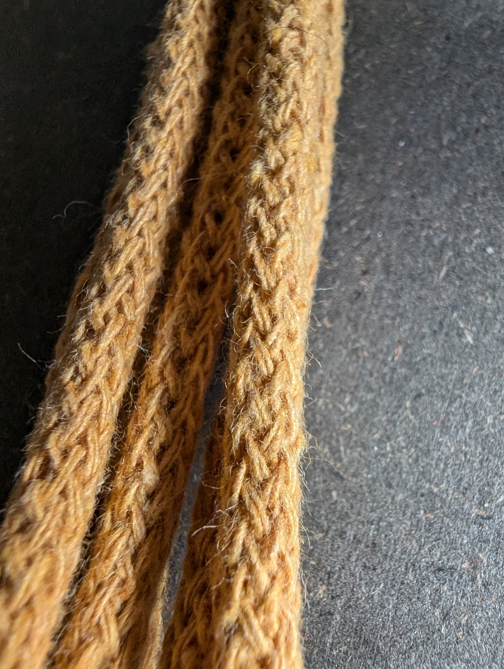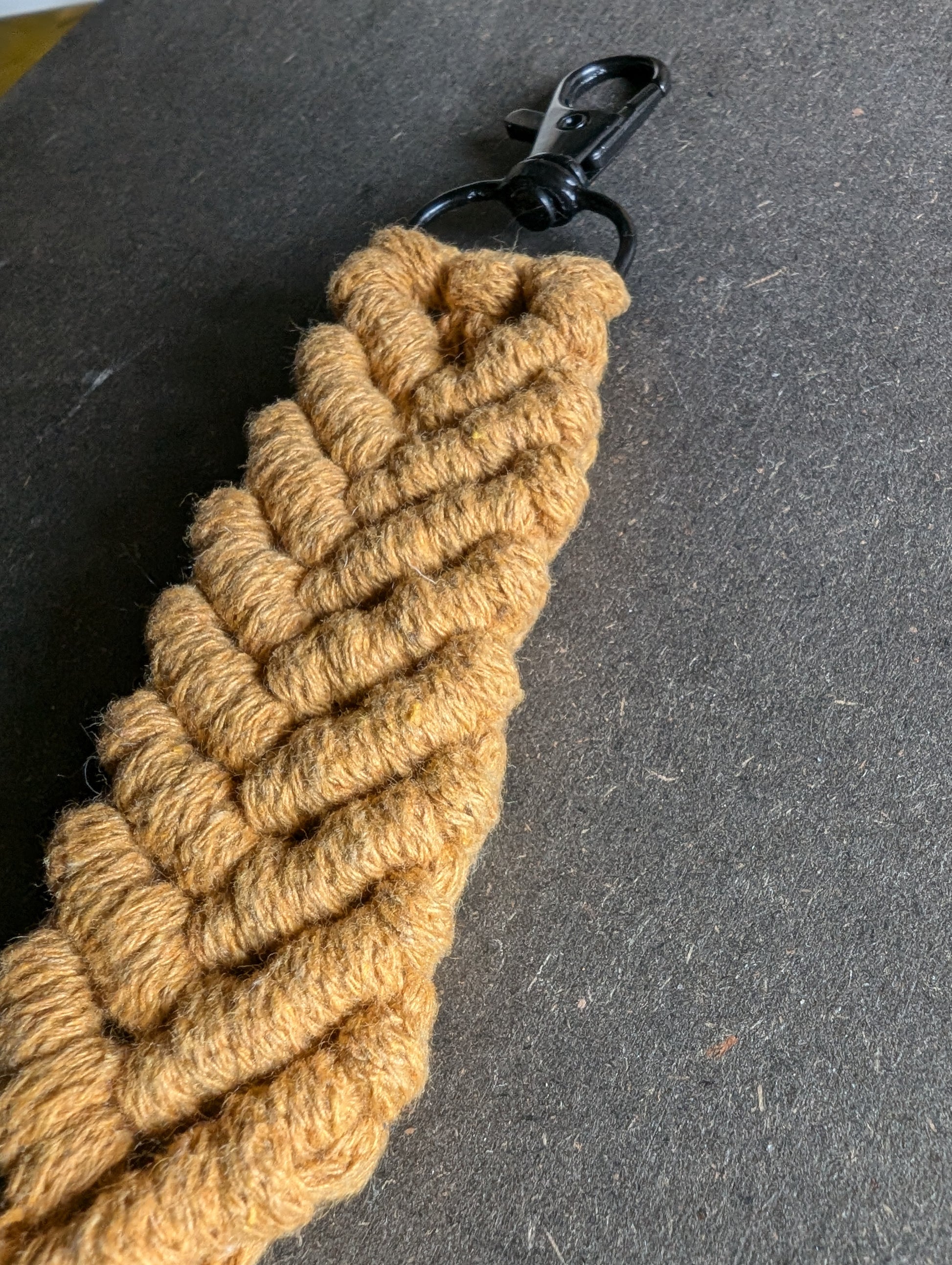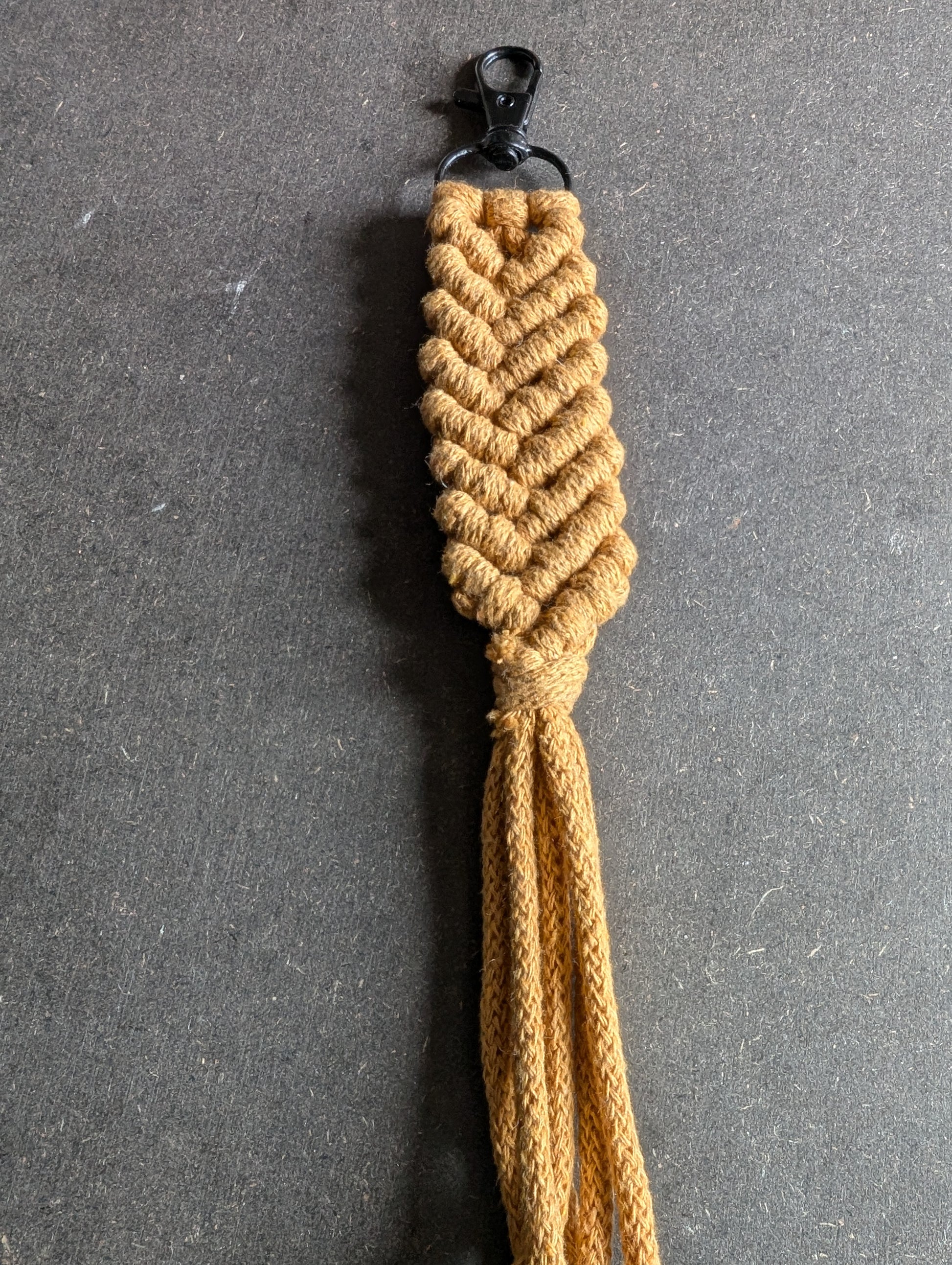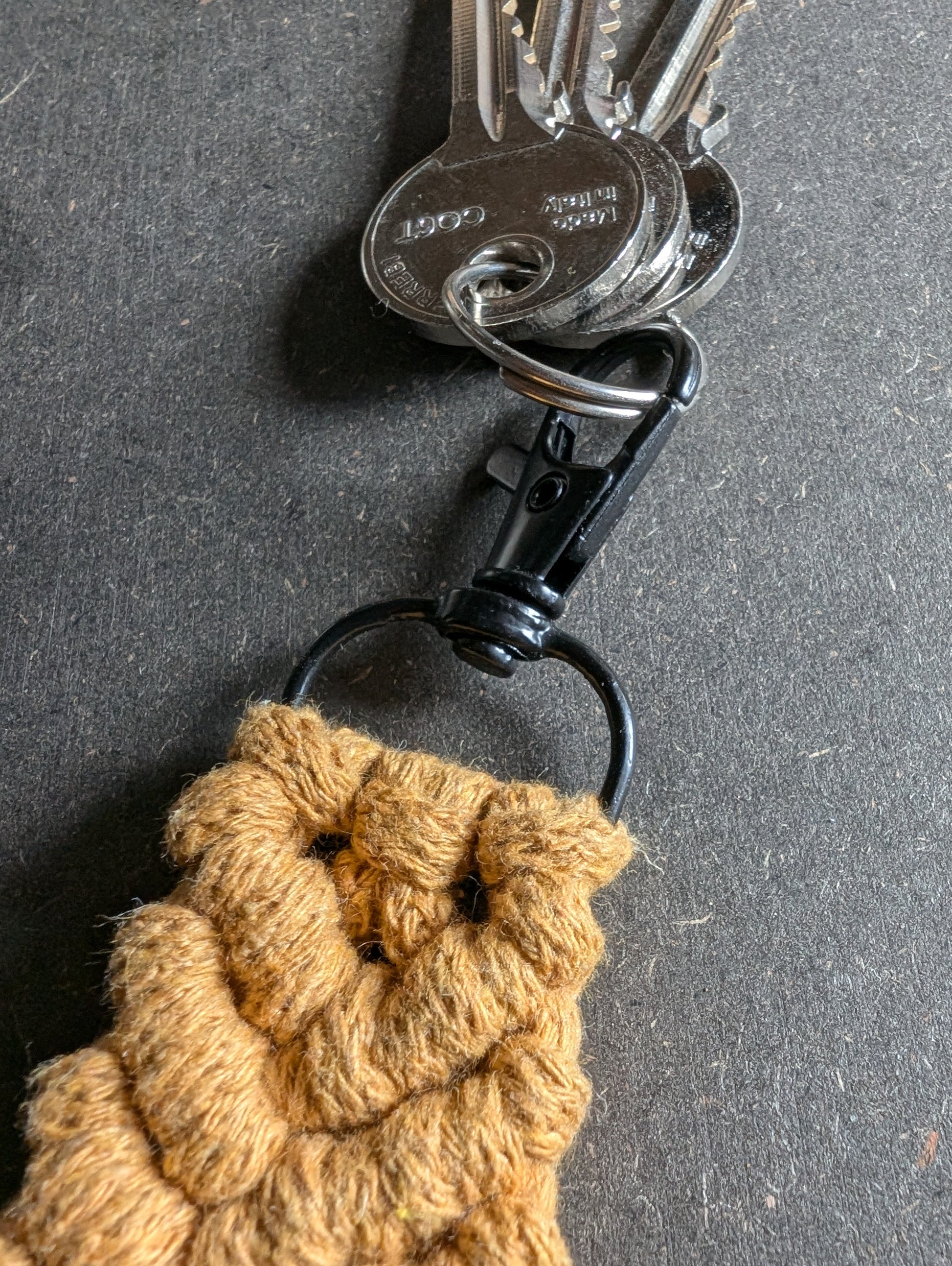 Portachiavi in macramè giallo senape con gancio colore nero titanio.