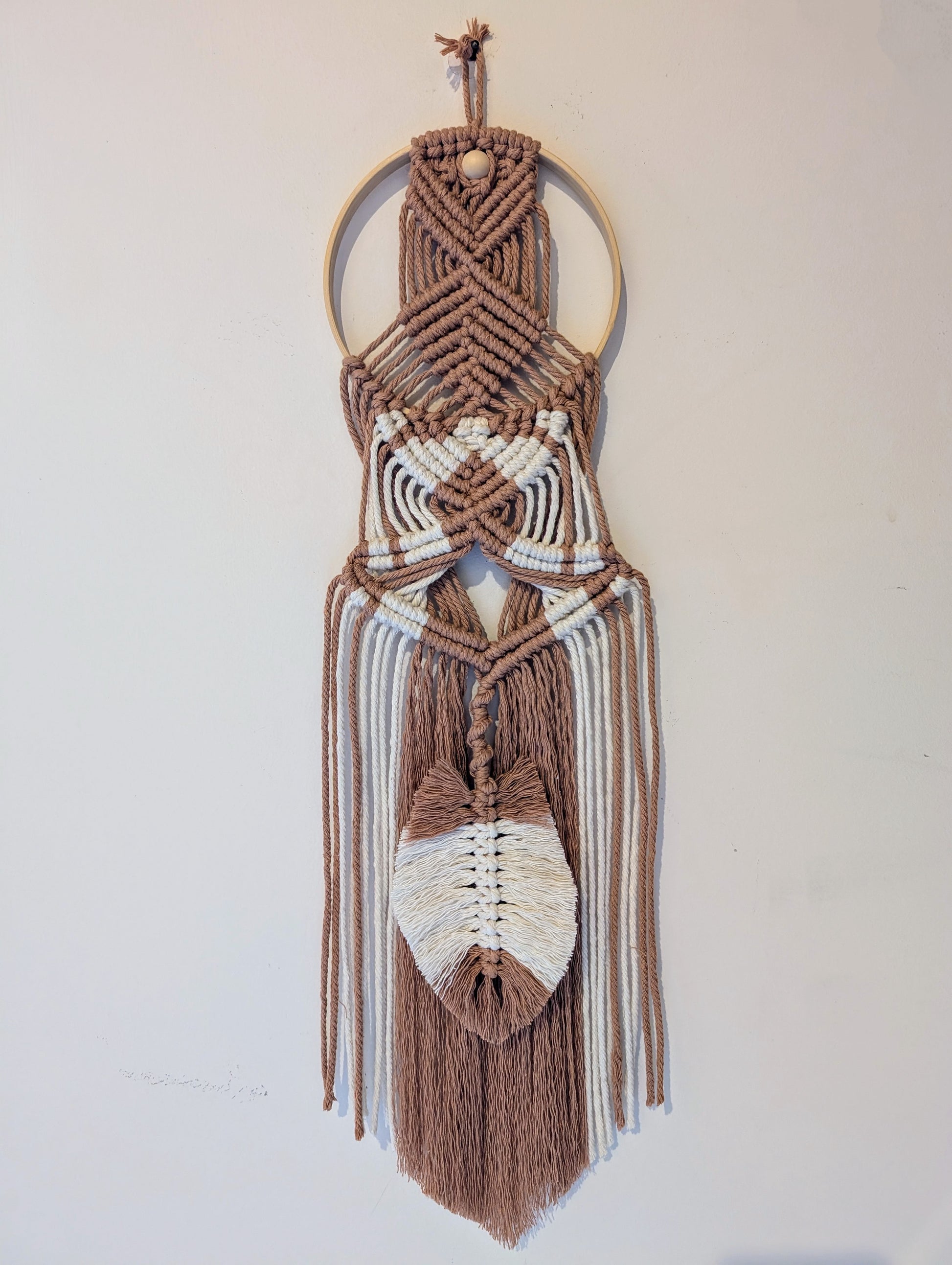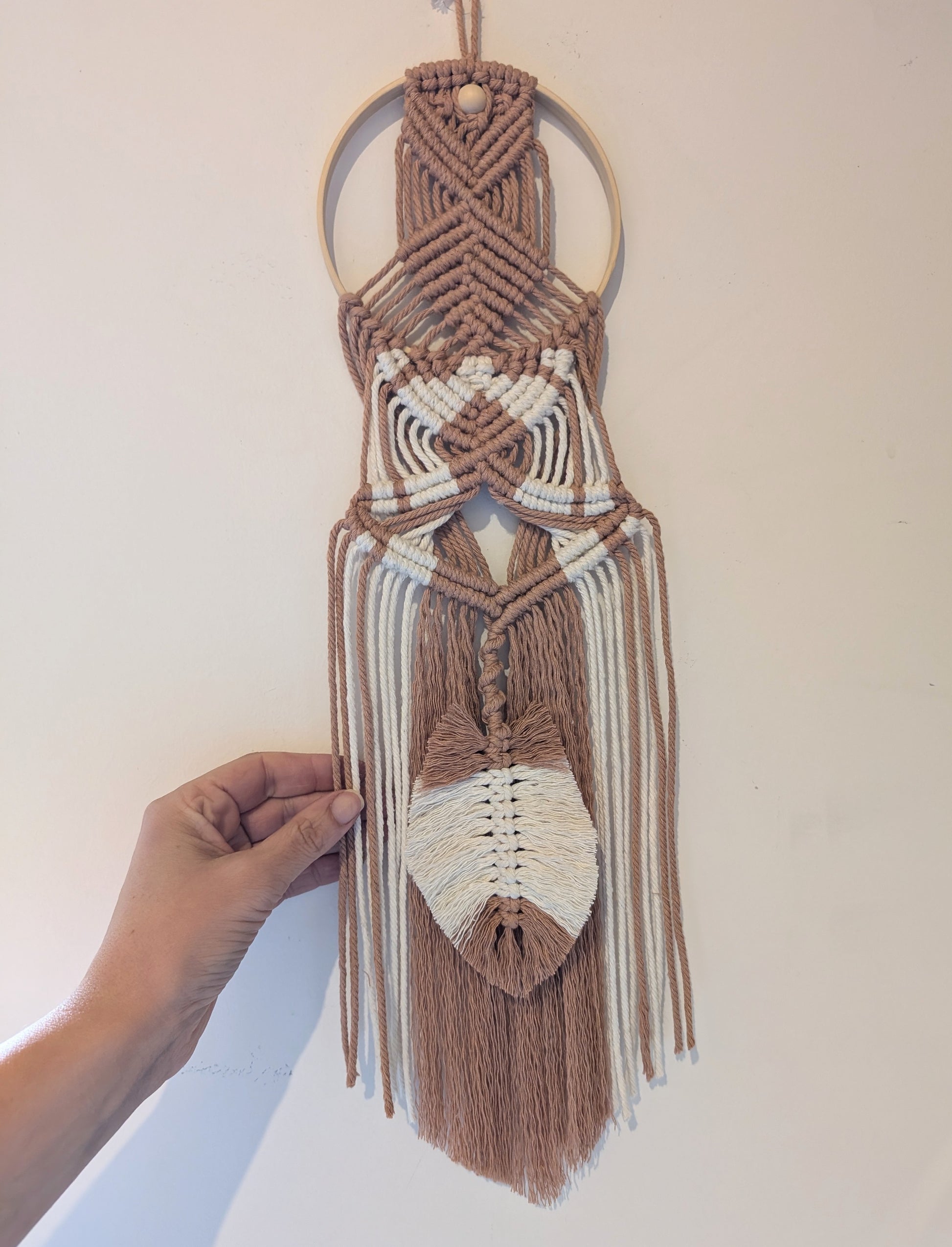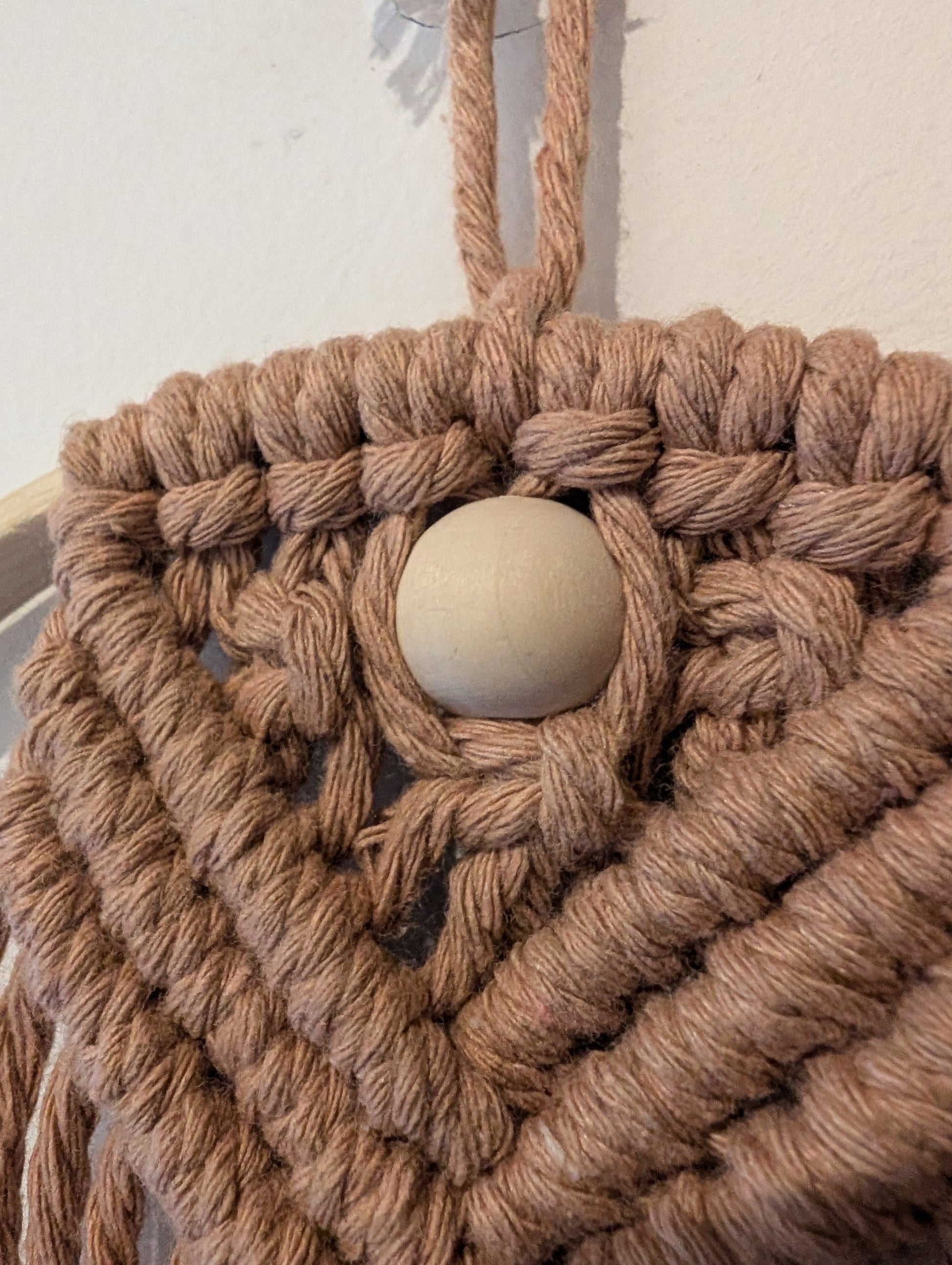 Questo scacciapensieri in "stile azteco" è lavorato interamente a mano con la tecnica del macramè.