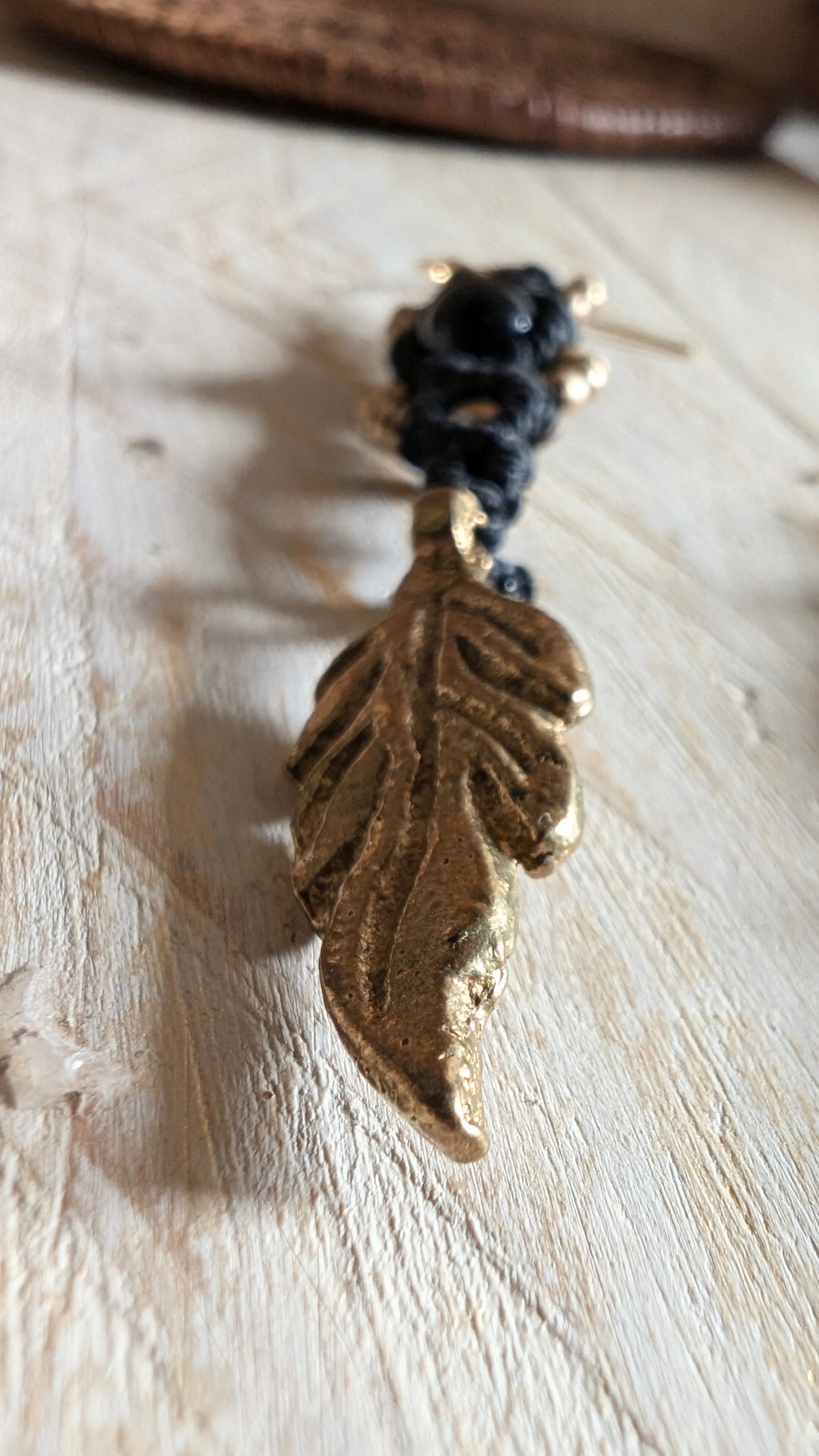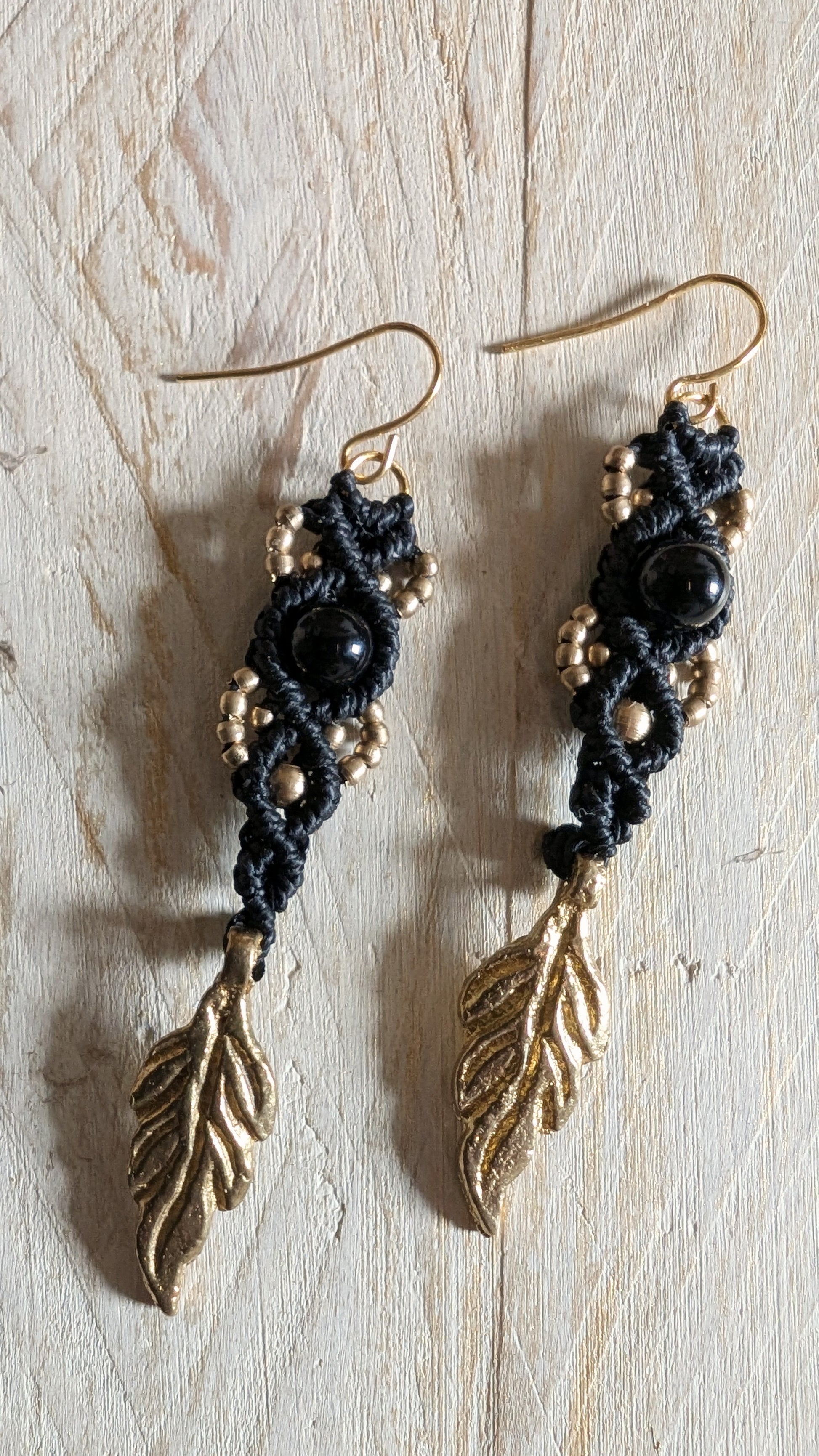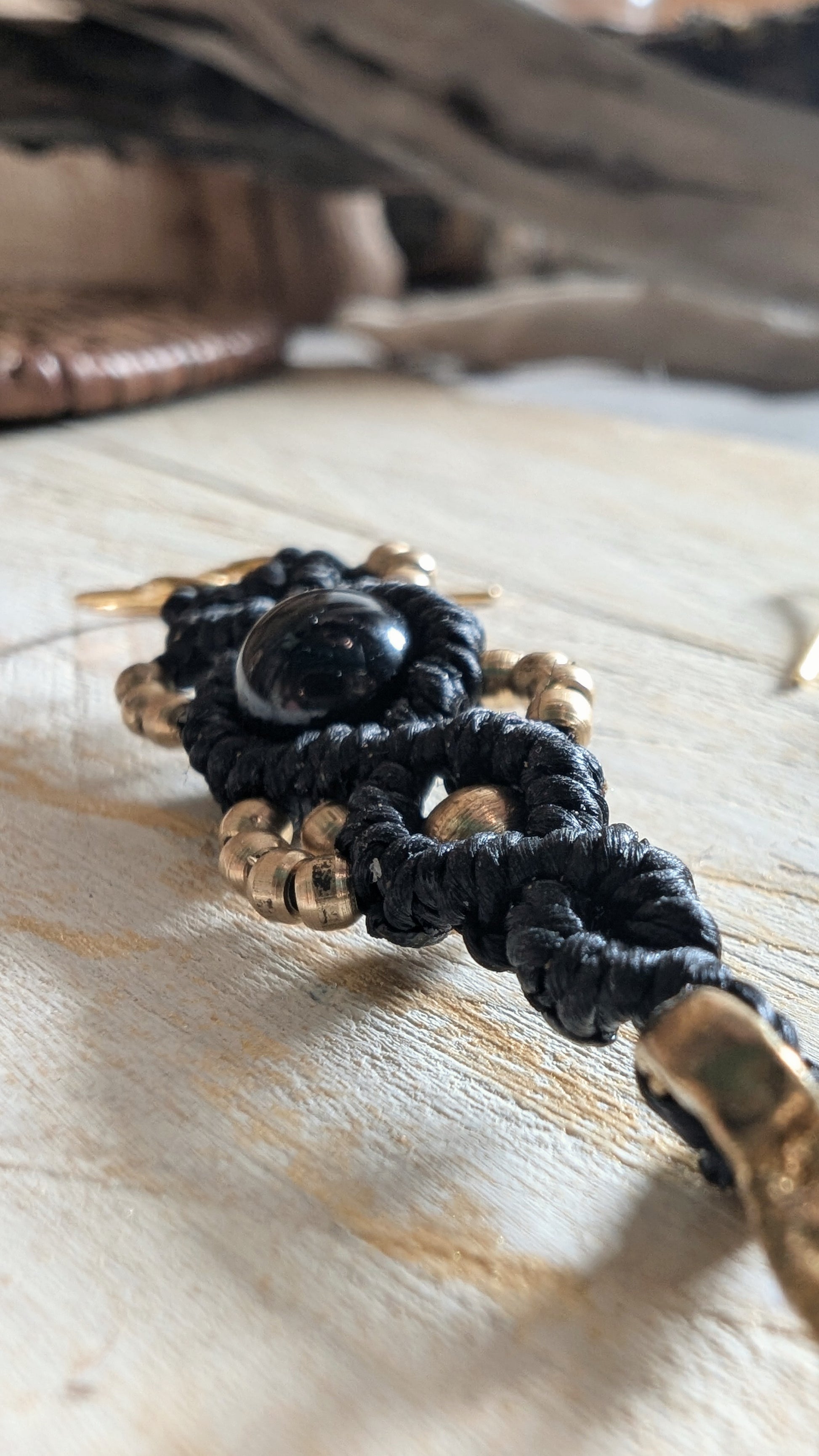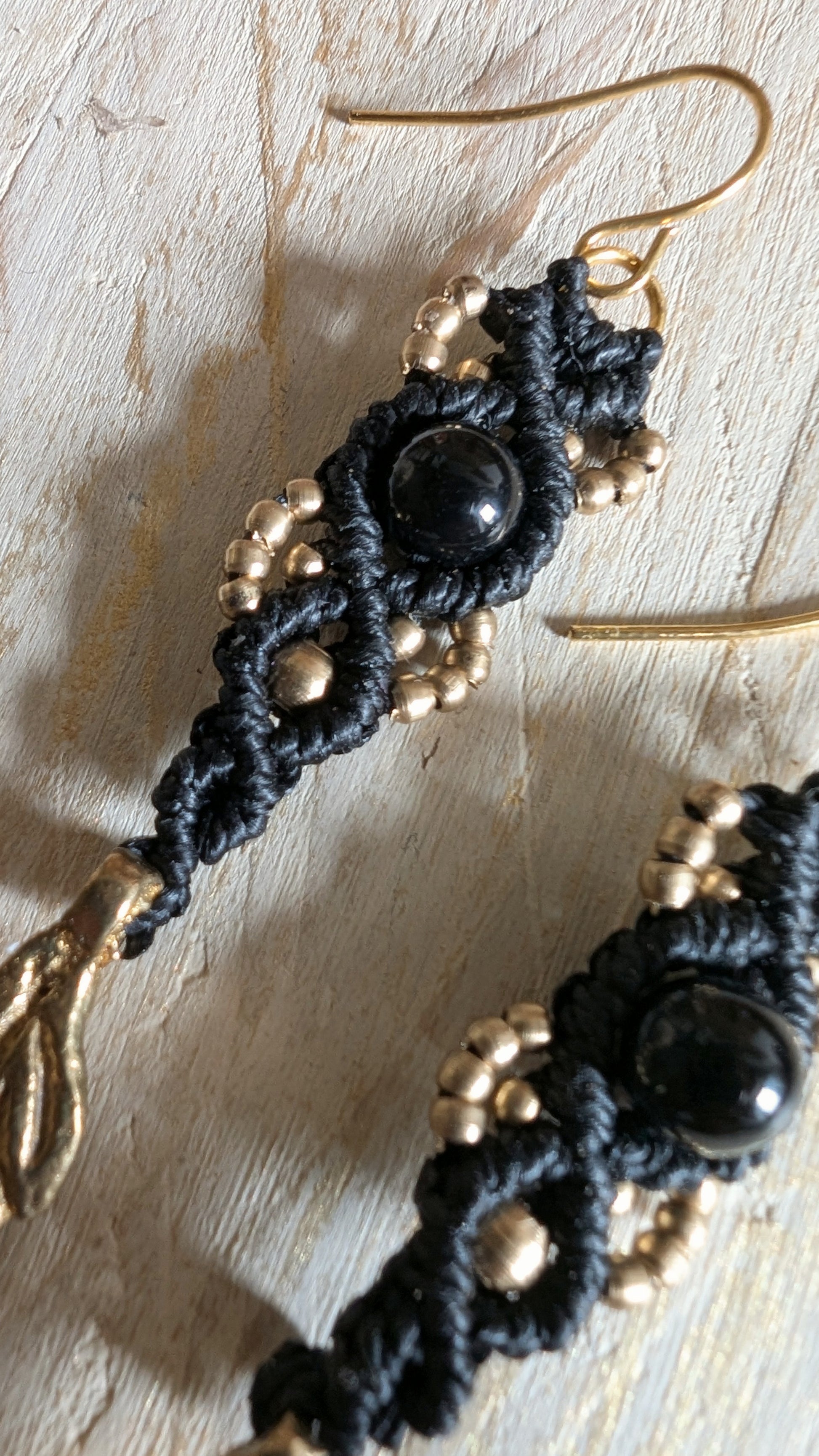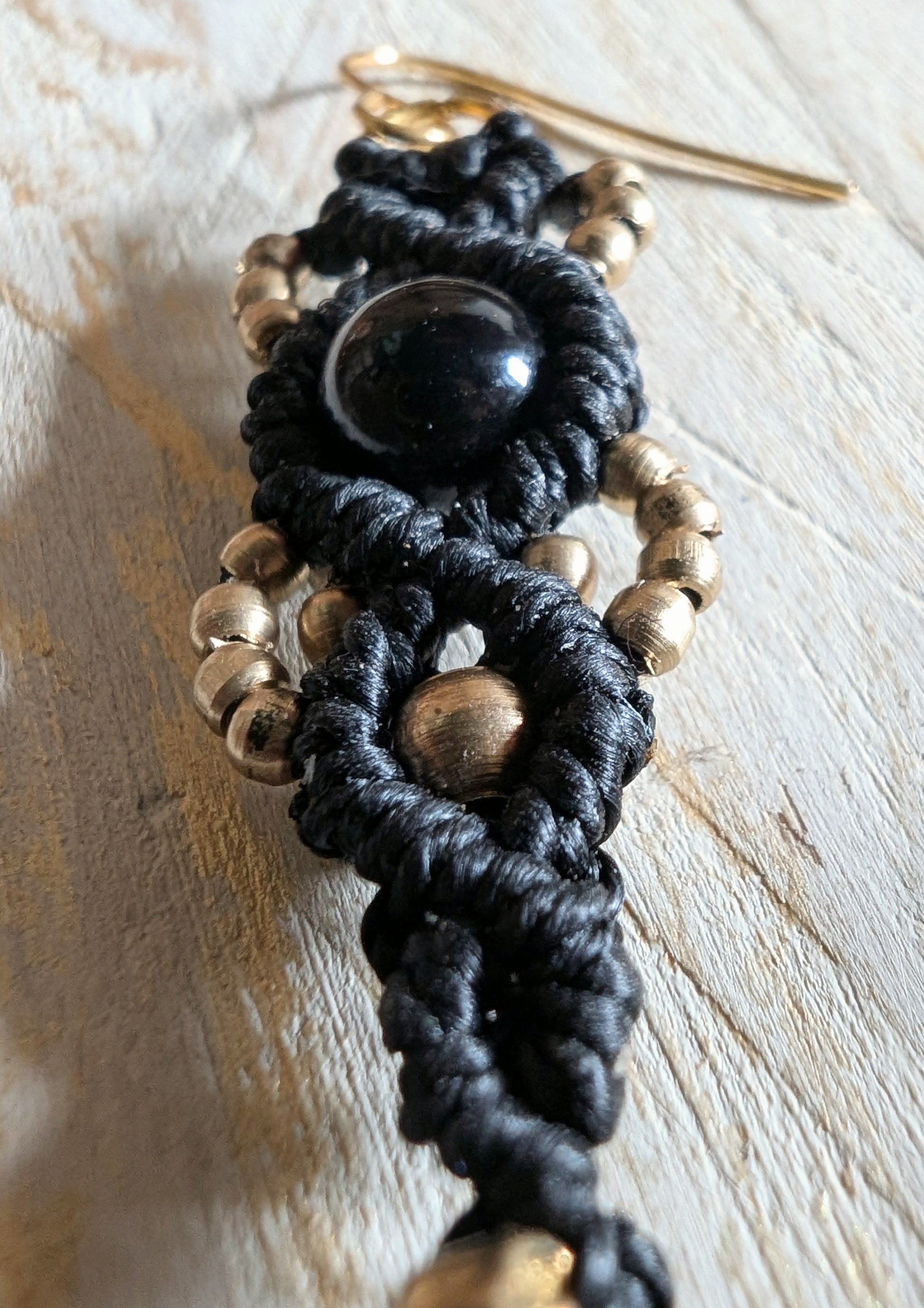 Orecchini in micro-macramè con charm in ottone e pietra onice nera.