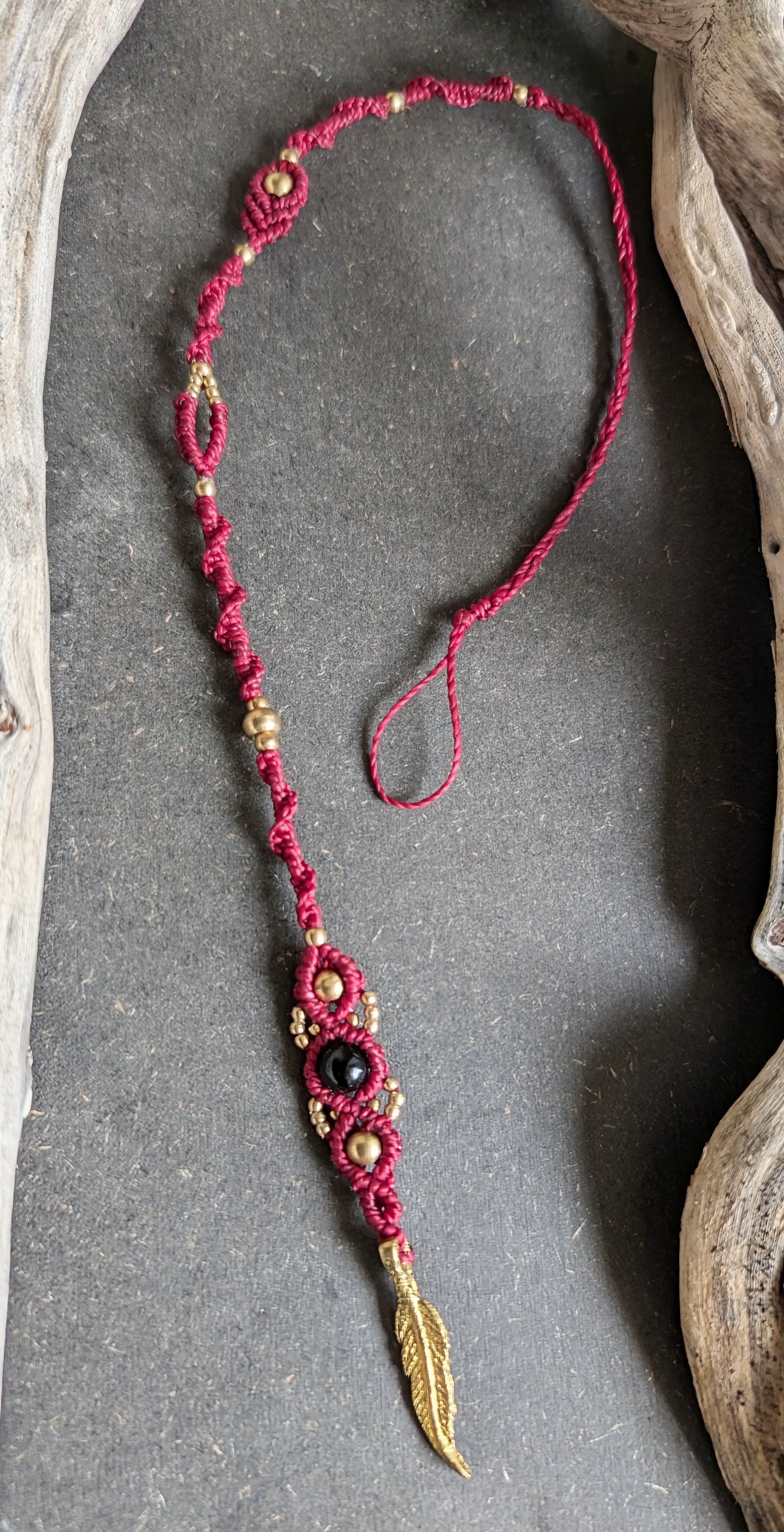 Treccina per capelli intrecciata a mano con accessori in ottone e pietra naturale onice nero.